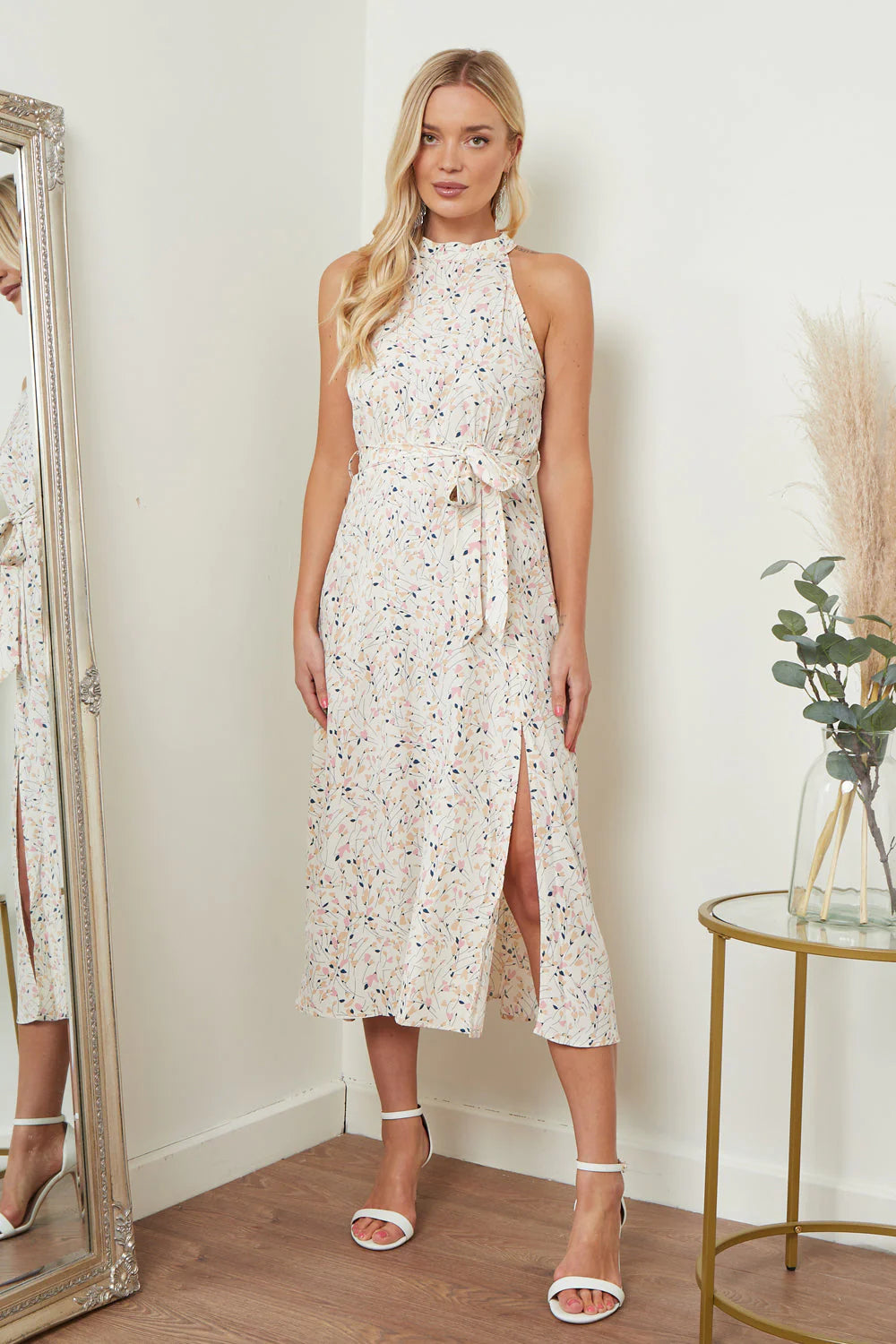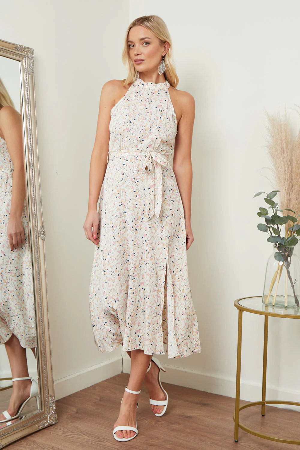 Col montée, robe longue à imprimé doux et floral, légère fente. |