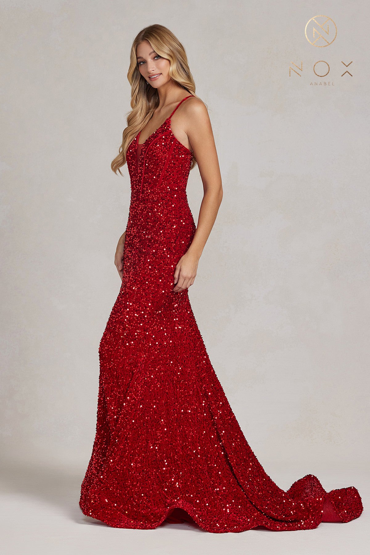 Sa coupe sirène ajustée épouse harmonieusement les courbes, tandis que le décolleté plongeant en V, soutenu par un tulle transparent, allonge la silhouette avec raffinement.