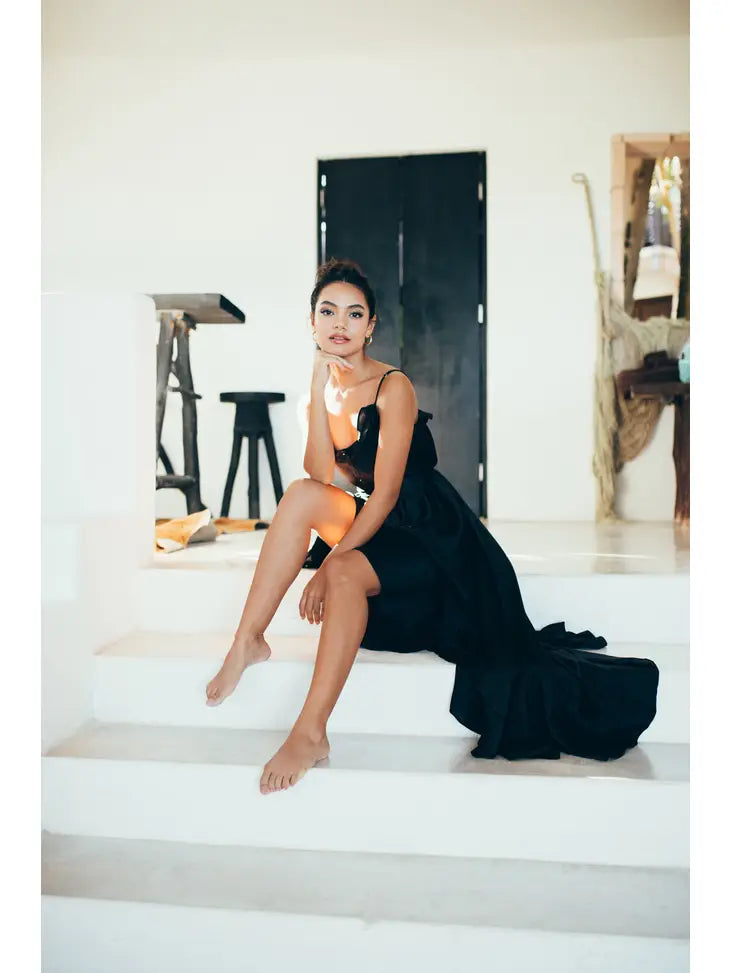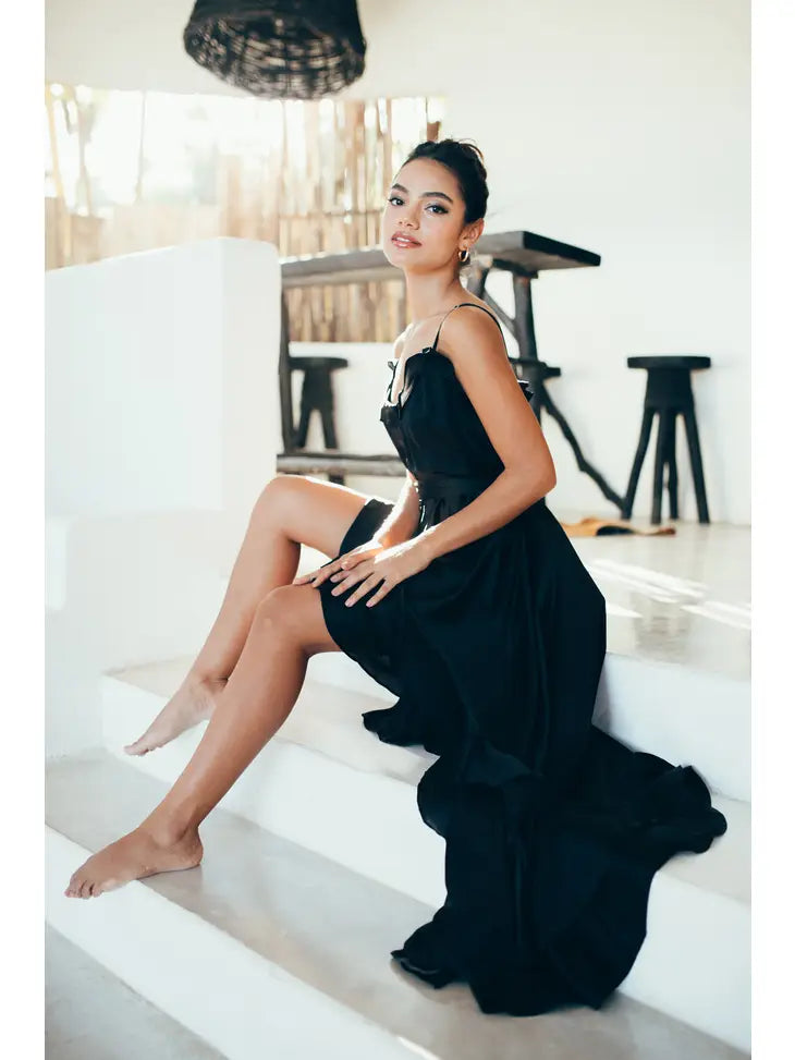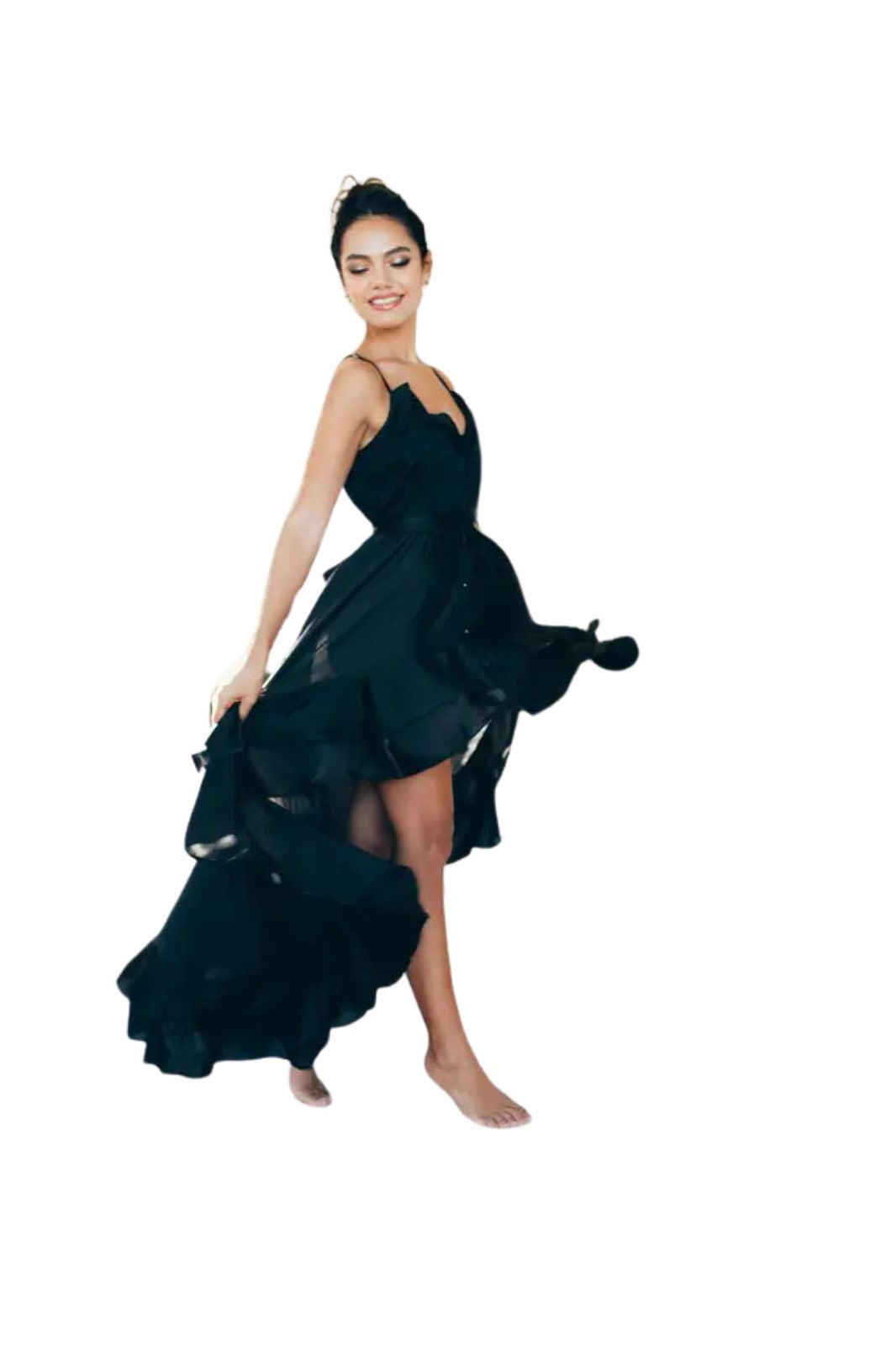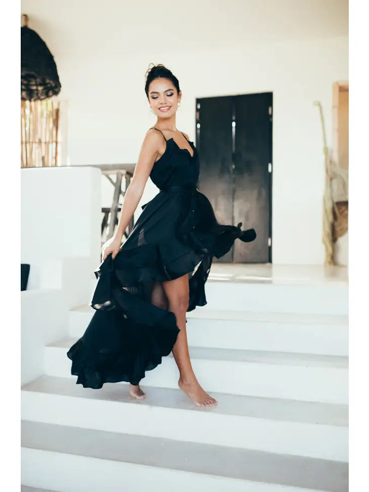 Fantaisie en noir, cette robe maxi à niveaux hauts à bas arborant un ourlet volanté et des boutons perlés sur le devant maintient un look décontracté tout en ayant l'impression de vous déguiser