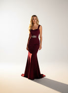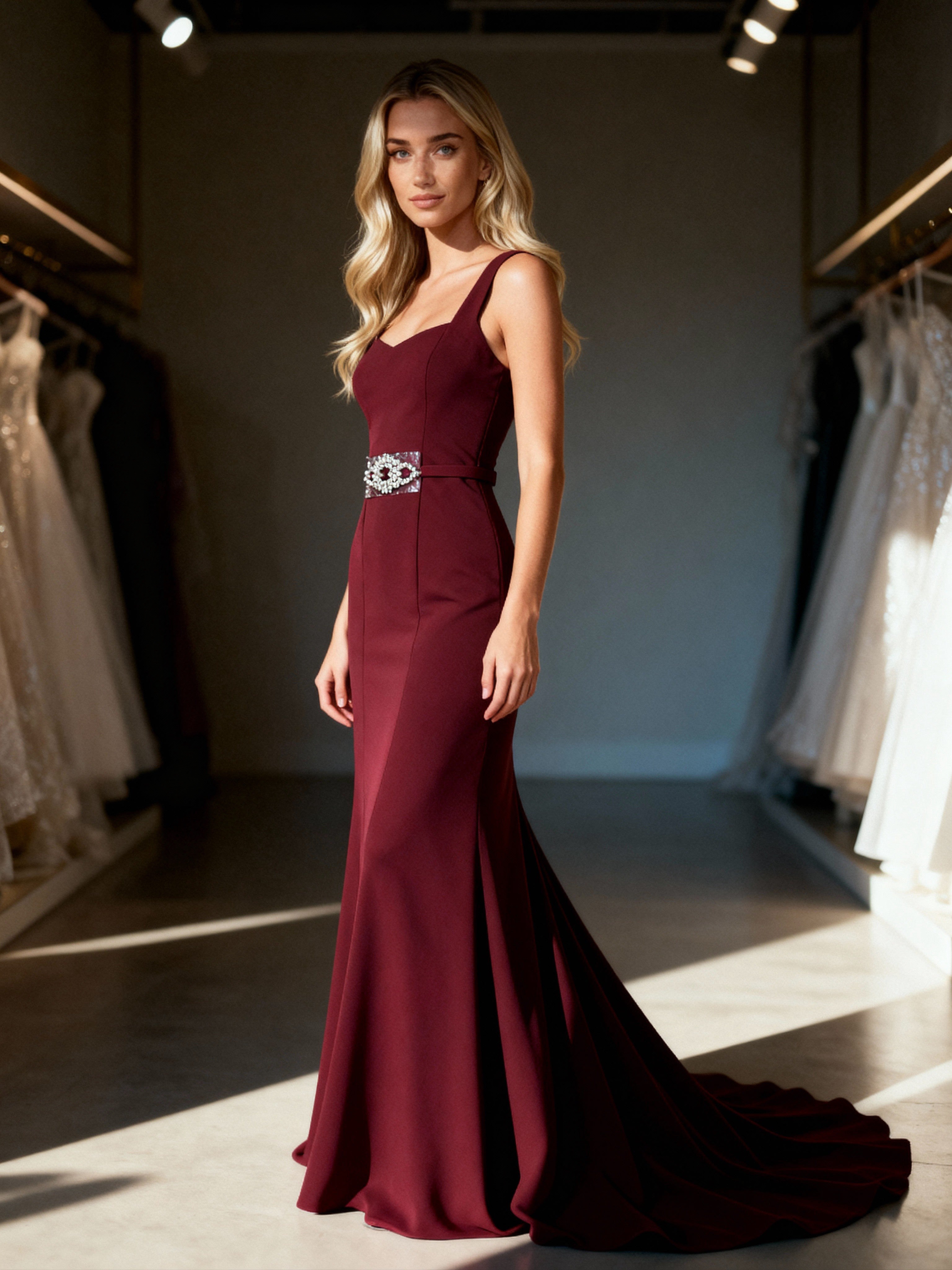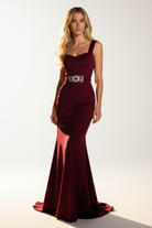 Confectionnée dans un tissu fluide de couleur bordeaux profond, elle offre une silhouette allongée et flatteuse, parfaite pour les événements habillés.
