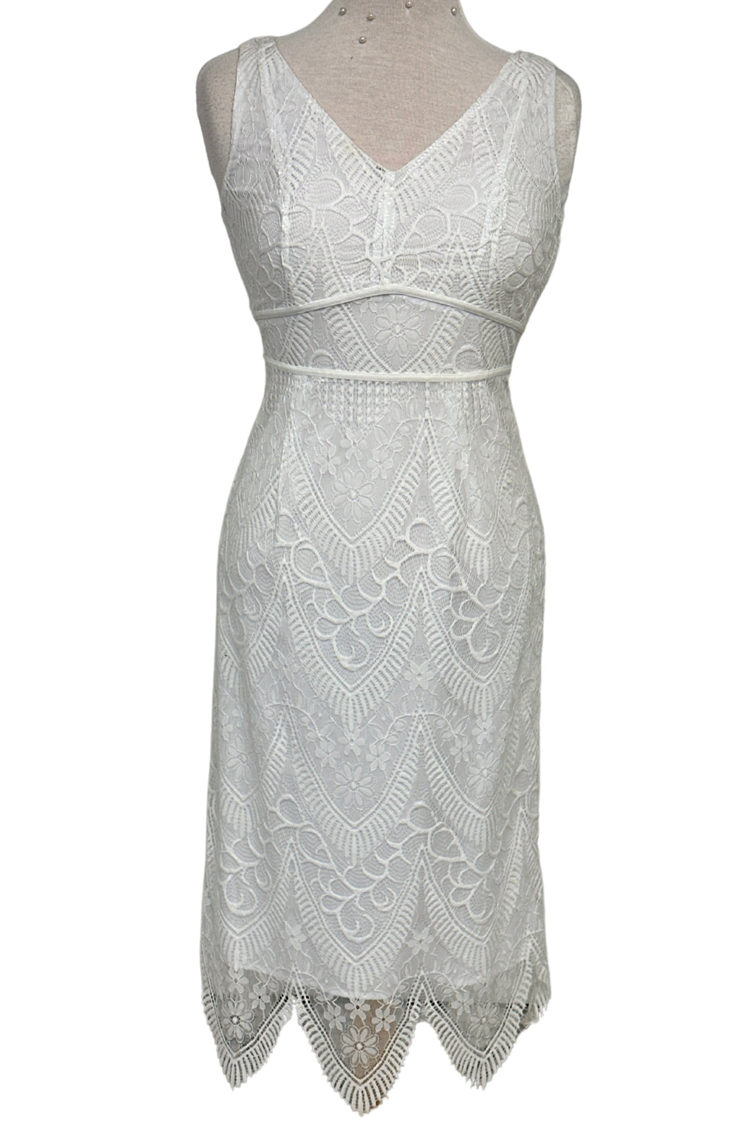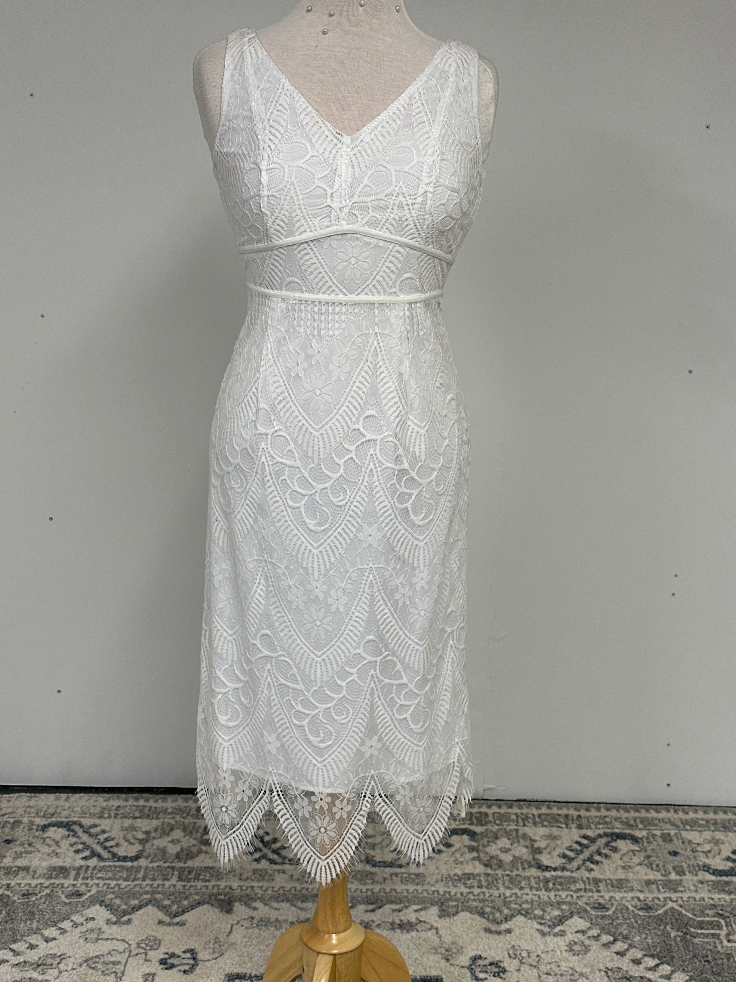La robe en dentelle blanche incarne l'élégance et la féminité avec un design raffiné et des motifs géométriques distinctifs. Conçue avec une coupe ajustée qui flatte la silhouette, elle se distingue par ses détails subtils et sa finition bordée en dentelle.