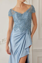 Faites sensation dans cette robe longue à manches courtes et épaules dénudées, ornée de perles et dotée d'une jupe fendue ajustée. Gracieuse et raffinée, cette robe pour la mère de la mariée associe une base en satin lumineux à un corsage richement brodé de perles pour une touche d'éclat supplémentaire, un décolleté en U flatteur et des manches courtes.
