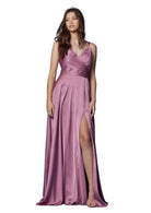 Son corsage croisé à décolleté en V met en valeur le buste avec douceur, tandis que la taille ajustée souligne la silhouette avant de s’ouvrir sur une jupe longue fendue au mouvement léger.