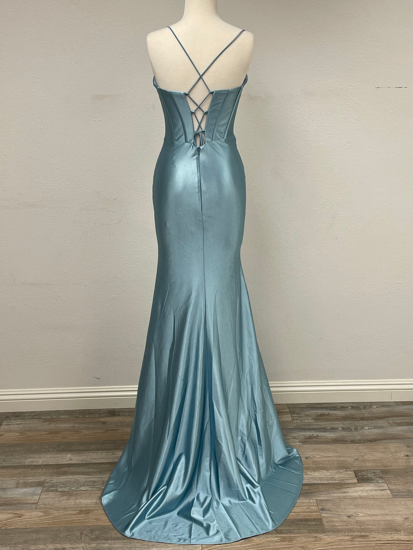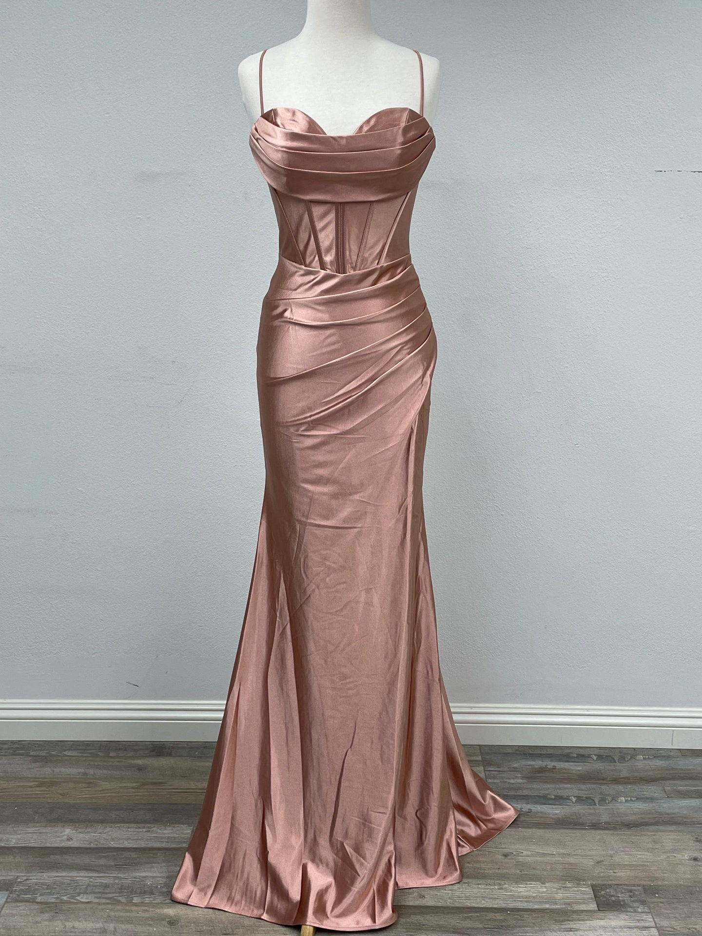 - Détails supplémentaires : Bretelles fines, fente haute, corset structuré, décolleté drapé