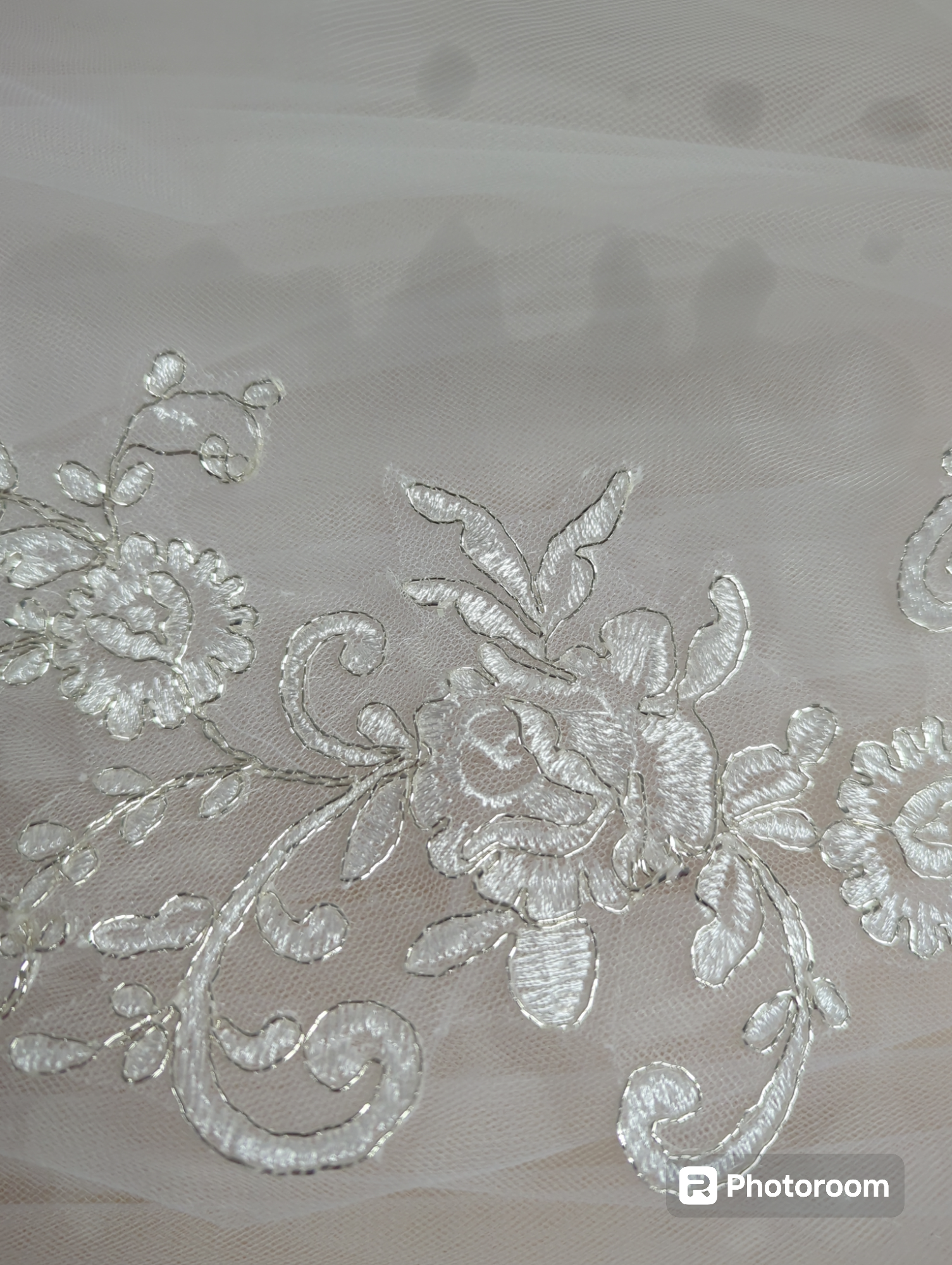 Jolie voile court, double avec une grande dentelle florale blanc et fil d'argent appliqué