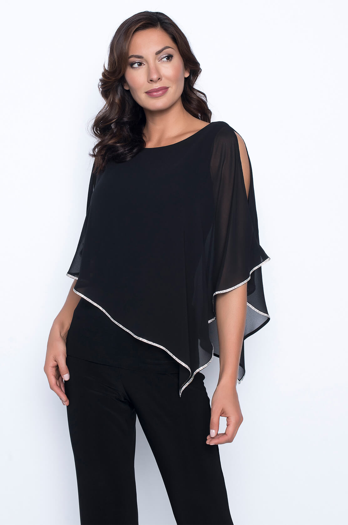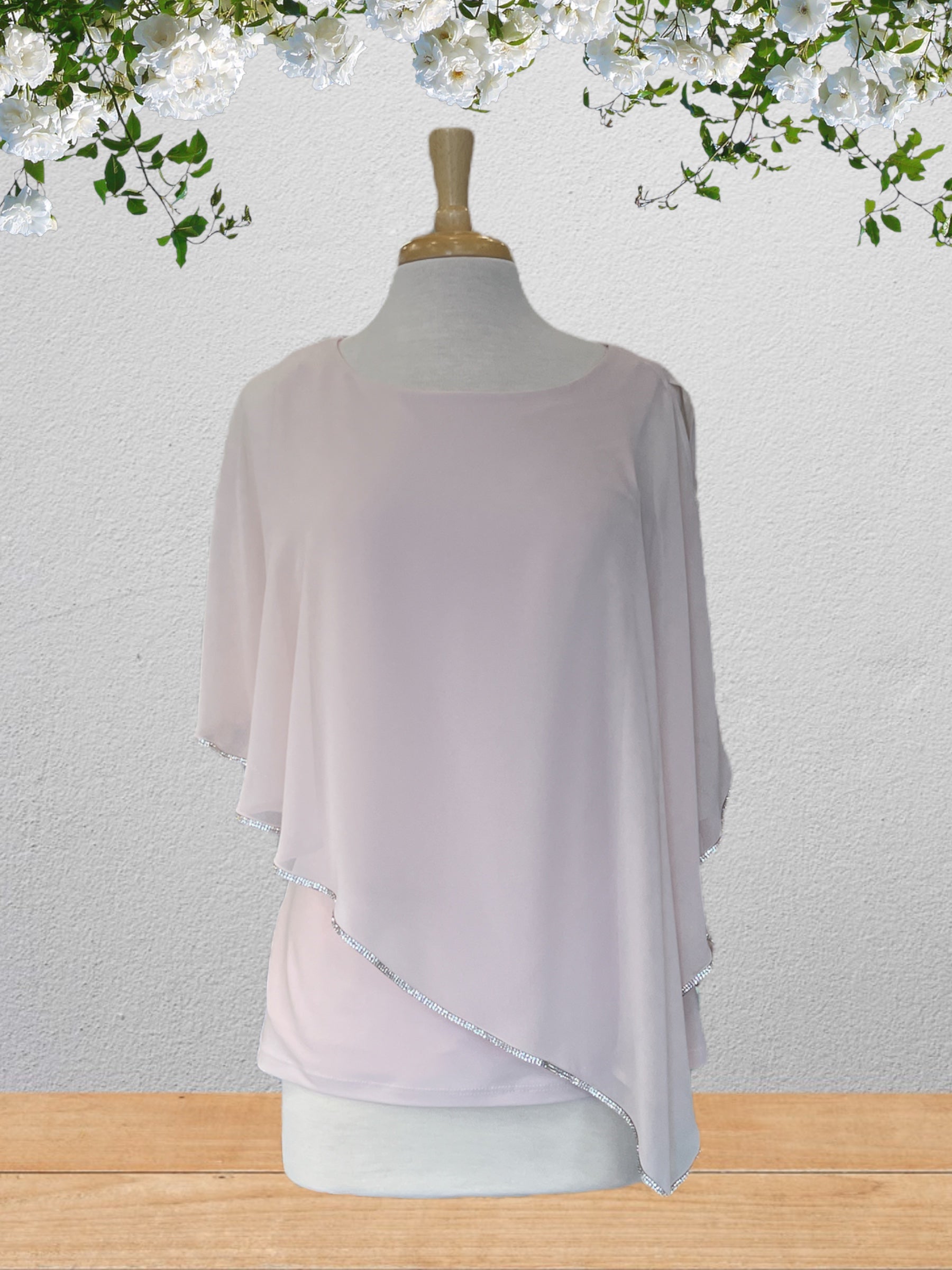 Description: Que vous portez un ''jean's'', un pantalon élégant ou une jupe, ce haut vous premet d'être distingué tout en étant confortable. Haut en jersey avec superposition en mousseline garnie de strass.