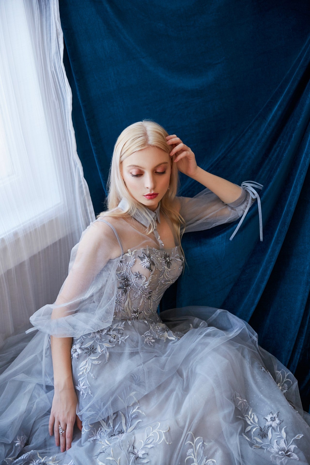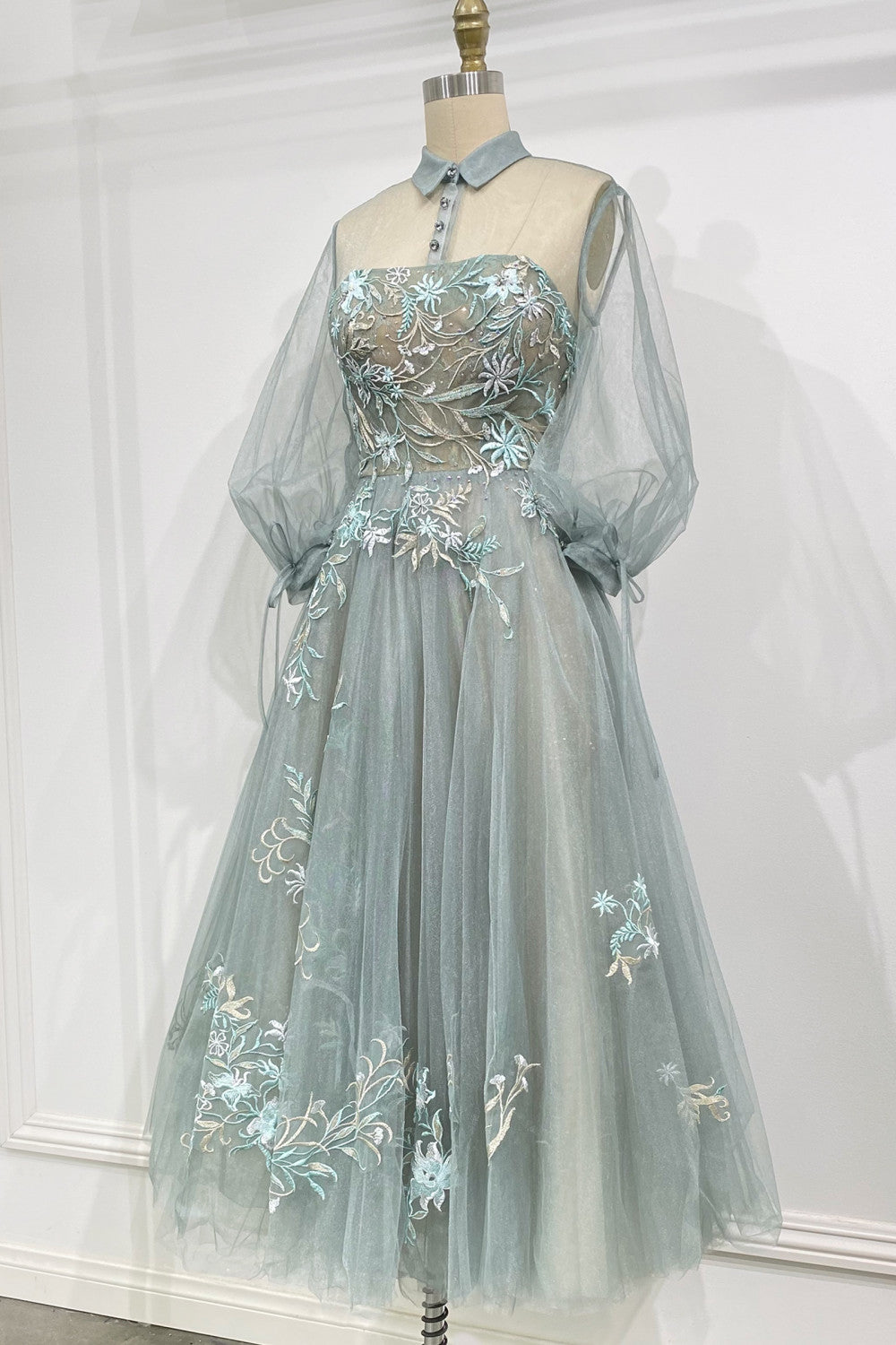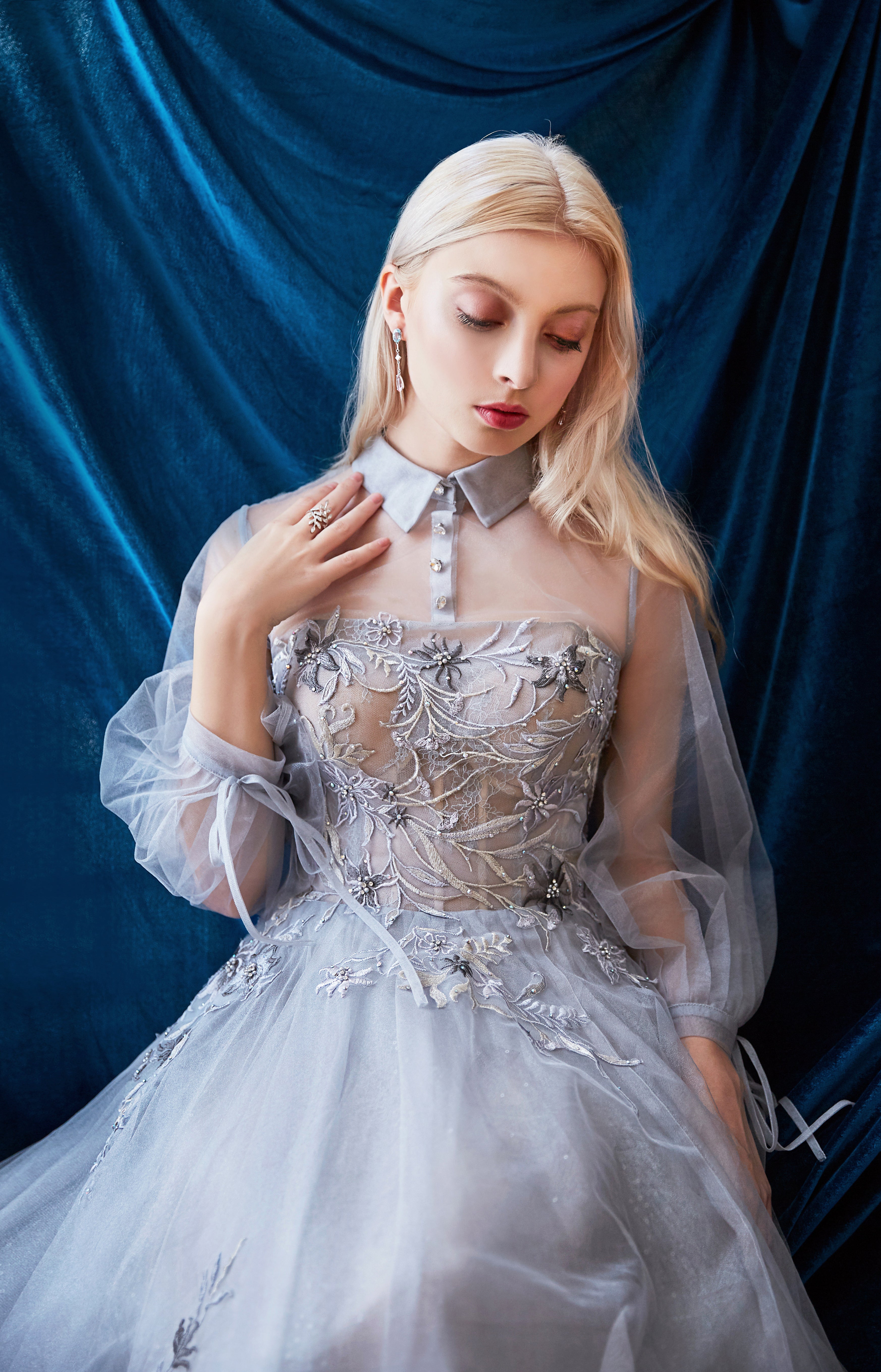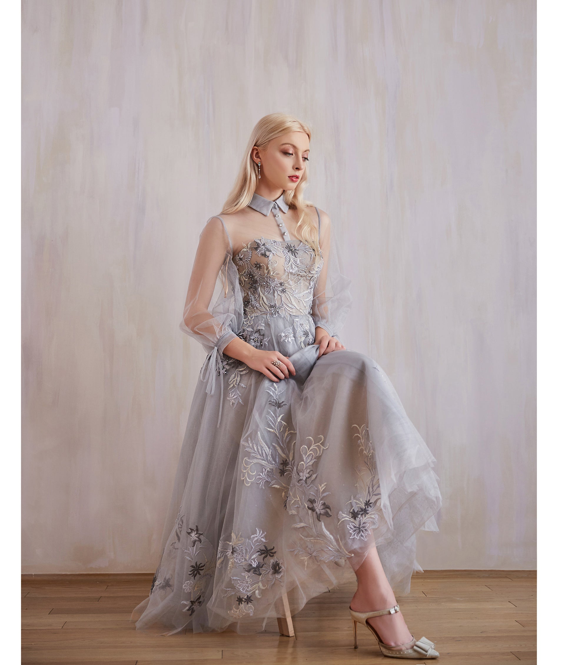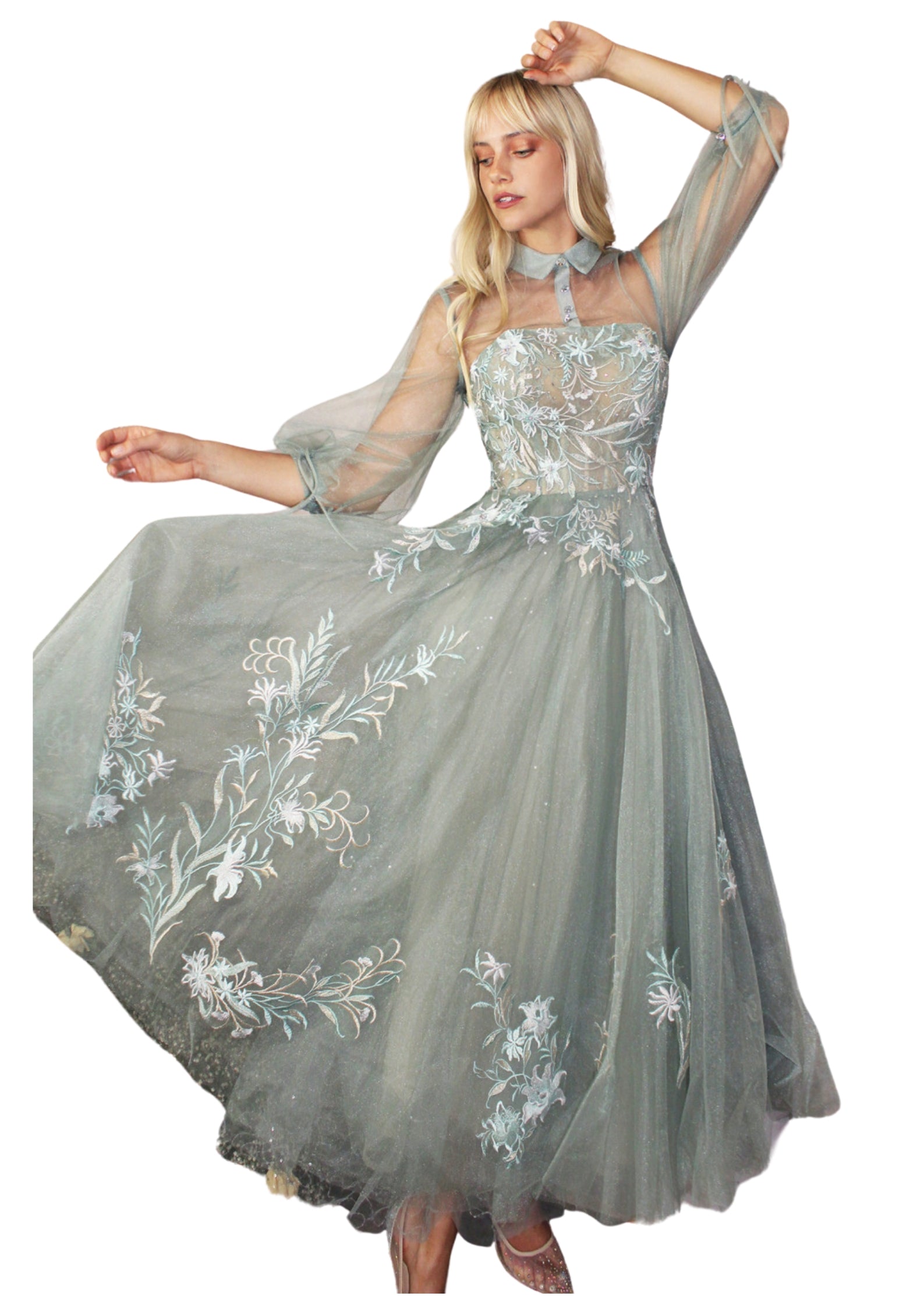 La robe A0862 séduit par son style unique, à mi-chemin entre conte de fées et élégance moderne. Confectionnée en tulle aérien de couleur sauge, elle est ornée de délicates broderies florales pastel. Son corsage transparent et structuré révèle un bustier intégré, tandis que ses manches bouffantes en tulle et son col chemise boutonné apportent une touche originale et gracieuse.