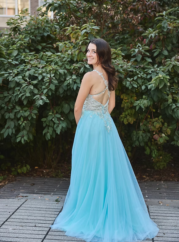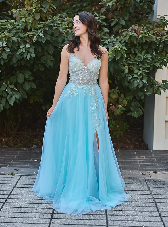 La jupe en tulle bleu aqua s’évase avec légèreté pour former une silhouette fluide et romantique. De superbes appliqués assortis descendent le long de la jupe, ajoutant texture et harmonie visuelle. La fente discrète apporte une touche de modernité tout en conservant une allure douce et féerique.