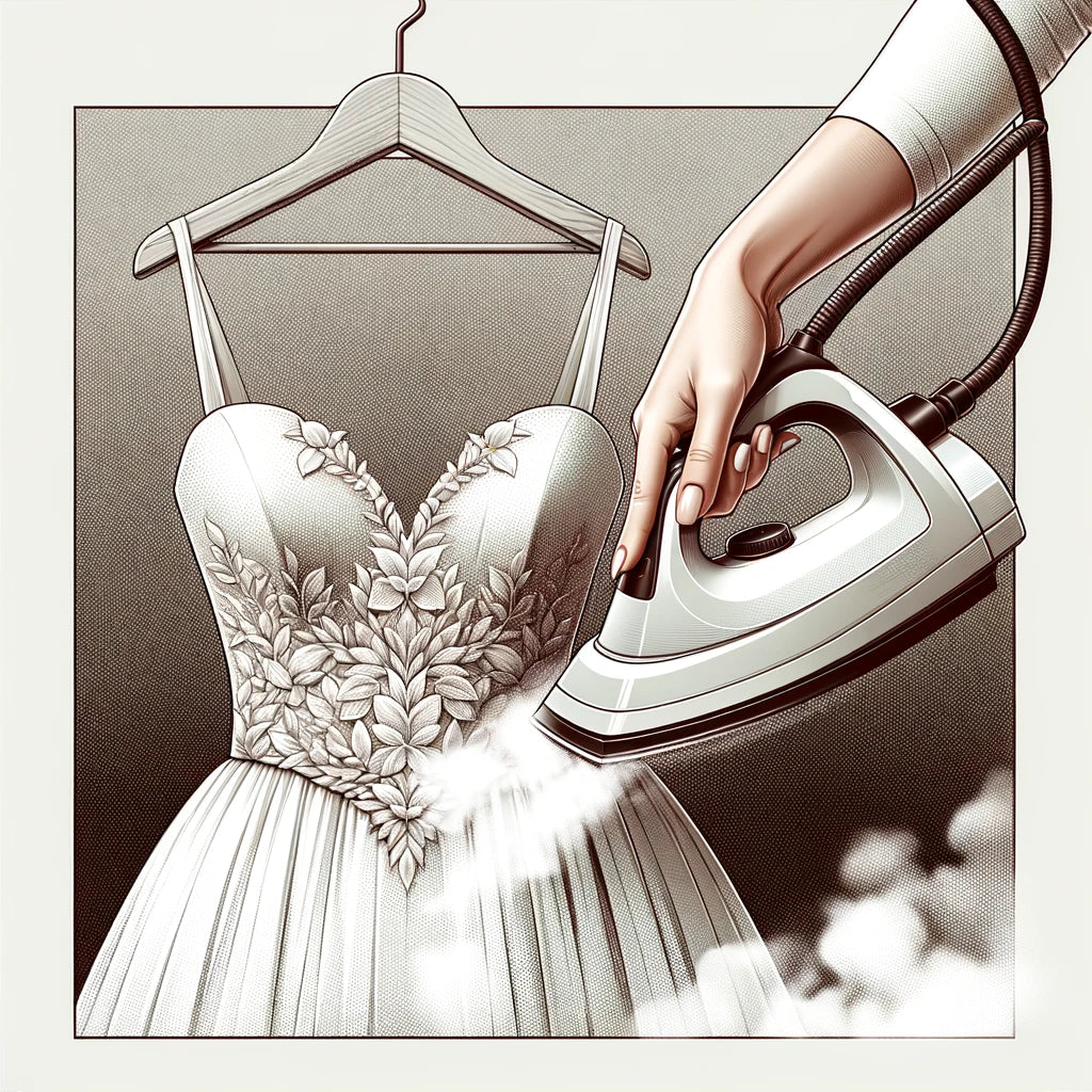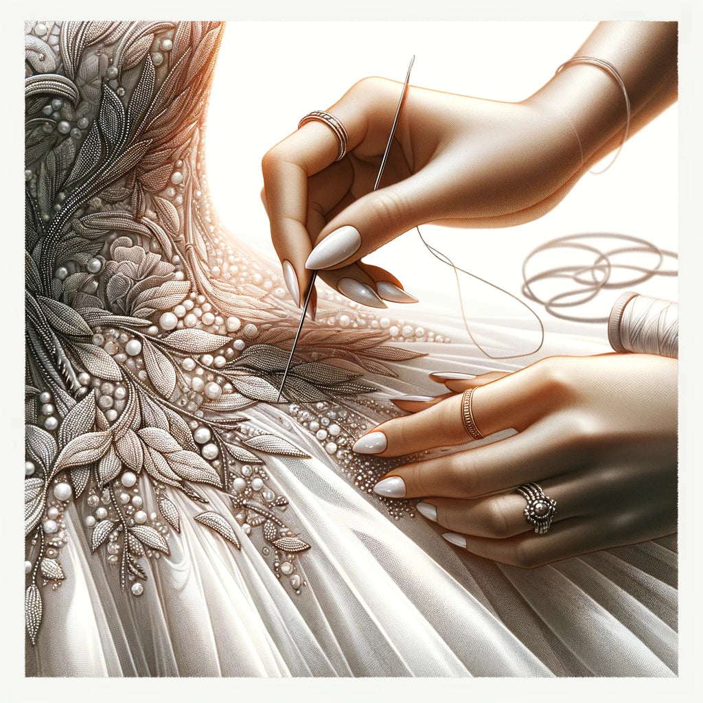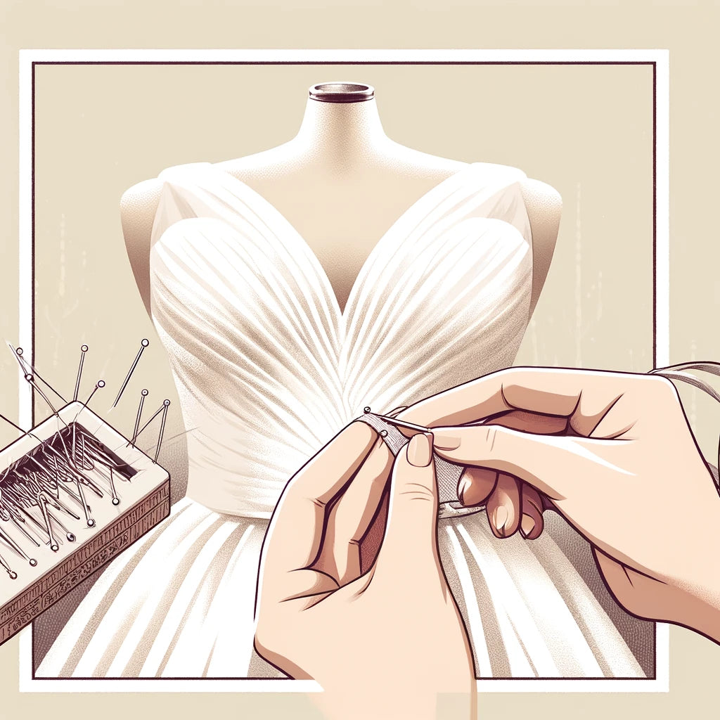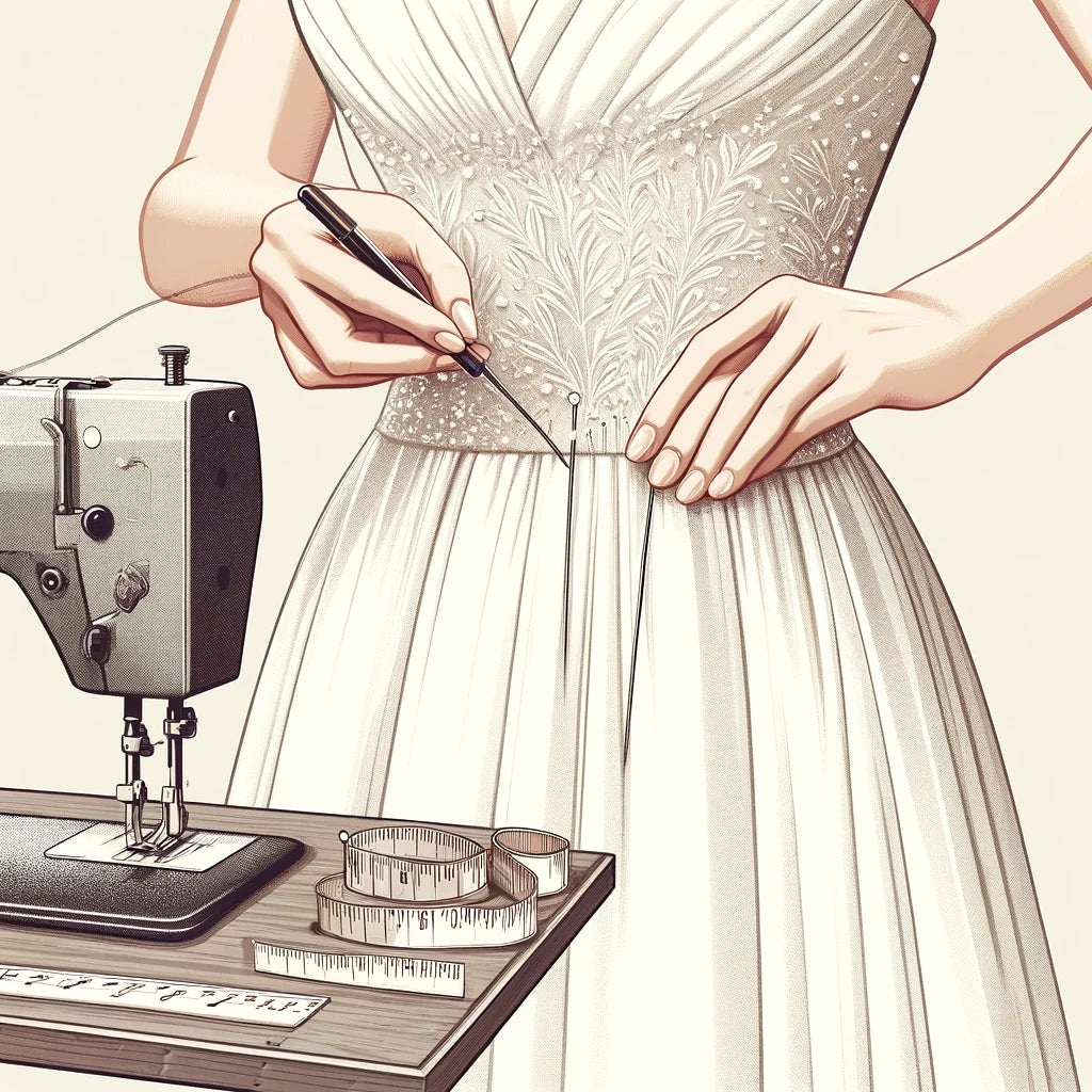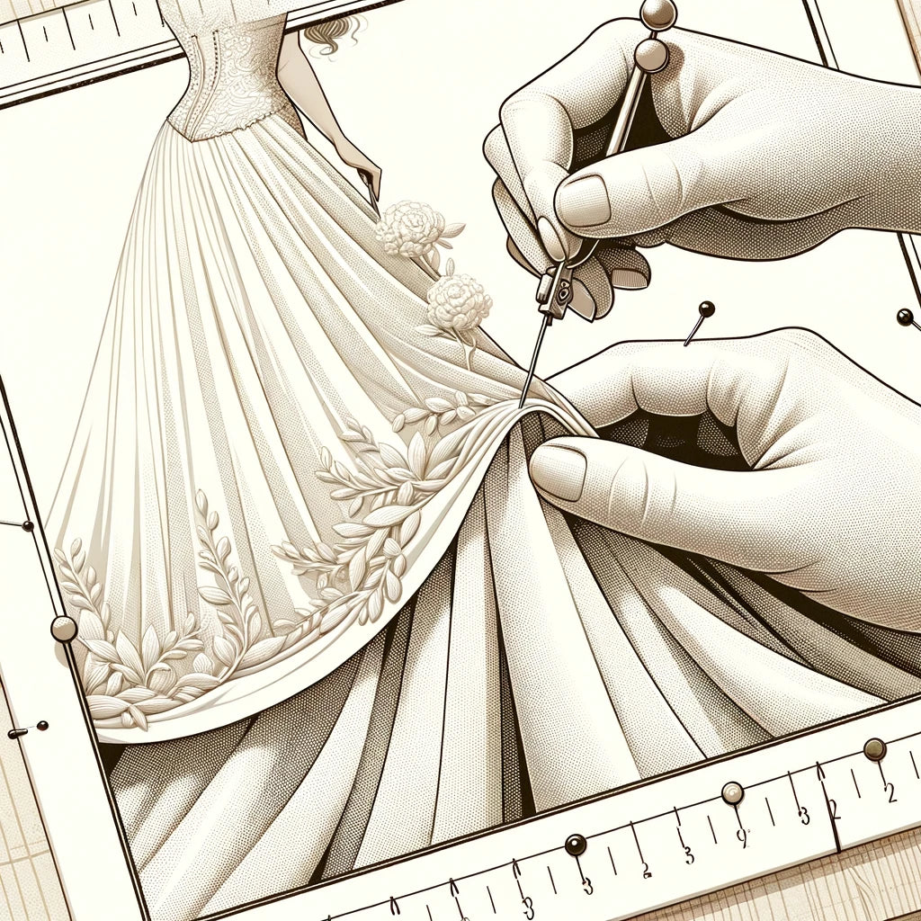 Description : Ajuster la longueur de la robe pour qu'elle s'adapte parfaitement à la hauteur de la mariée ou de la personne qui la porte, en veillant à ce que la robe touche juste le sol ou se drape de manière appropriée.