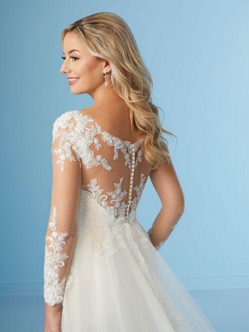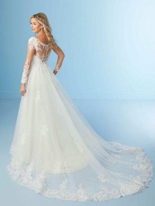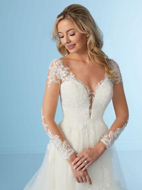 Description: We have you covered in lace and tulle in a long sleeve gown still featuring sheer tulle and applique sleeves. A plunging neckline with a sheer top and low back matching the lace on a princess skirt is sure to turn heads... beautiful lace is placed on the skirt and borders the train.