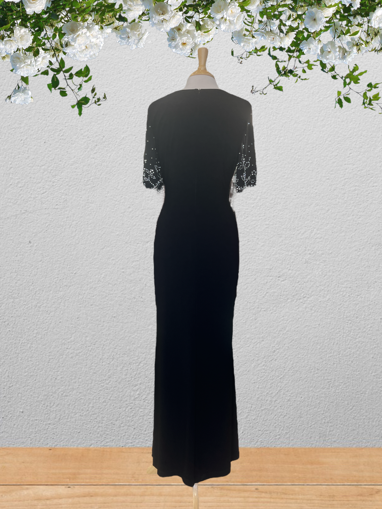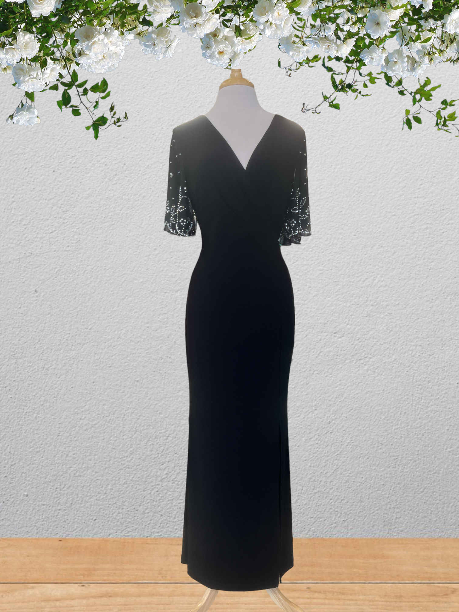 Description: Midnight wrap dress with empire waist and beaded chiffon sleeves.