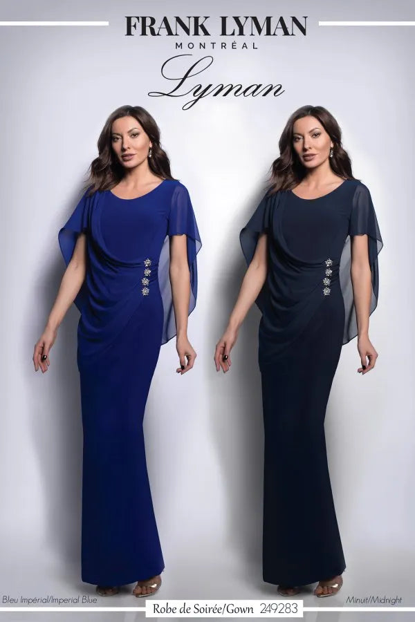 Experience timeless elegance with this stunning evening gown by Frank Lyman. Designed to flatter the figure, this maxi dress features a delicate scoop neck and sheer voile sleeves for a touch of elegance. The draped front accentuates the waistline while adding a fluid, feminine feel. Floral rhinestone embellishments enhance the drape, adding a touch of glamour to this piece. Available in two classic colors: Imperial Blue and Midnight , this dress is perfect for any formal occasion.