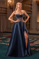 Sa coupe bustier cœur drapé met en valeur le décolleté tout en restant raffinée, tandis que son corset scintillant aux lignes verticales élance la silhouette avec subtilité.