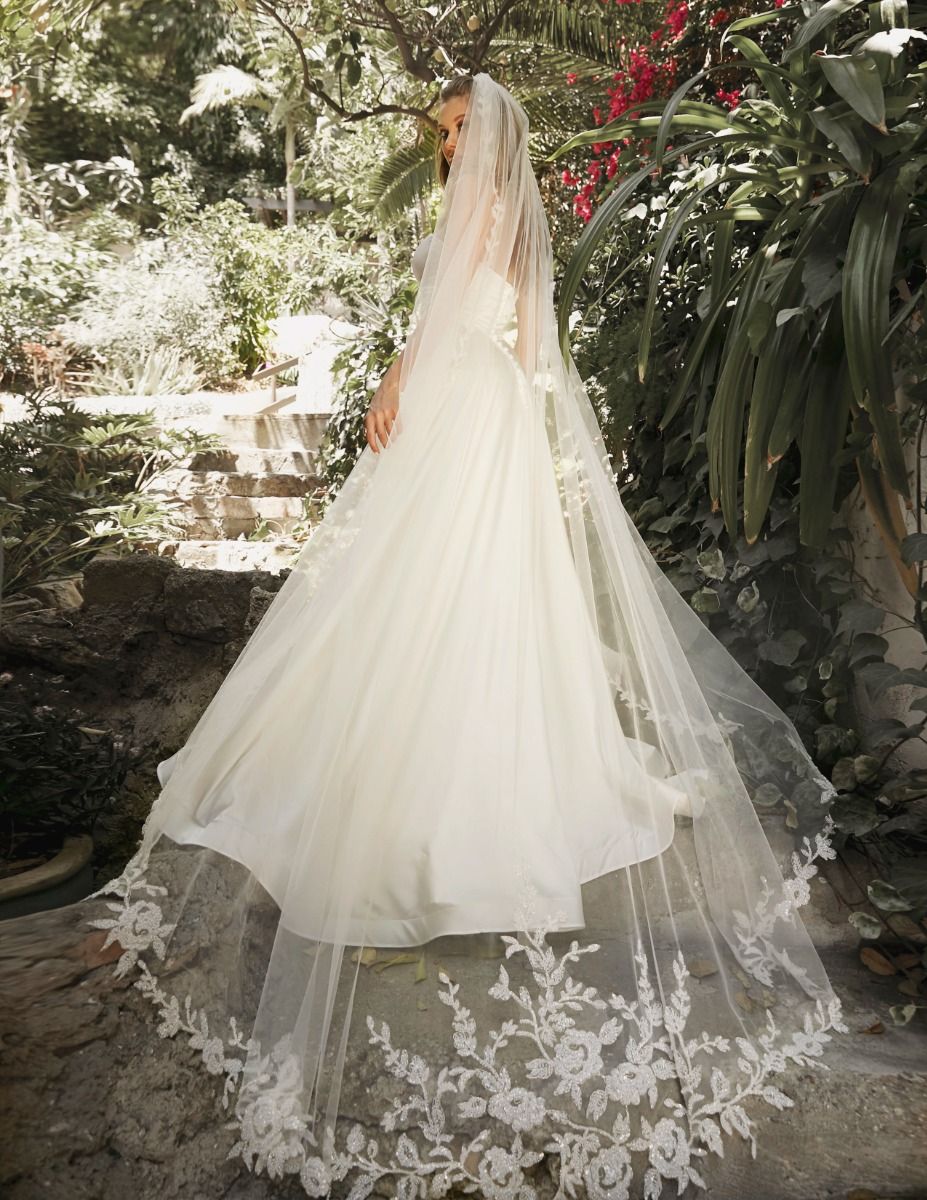 Ce voile de mariée en tulle fin et aérien est délicatement orné de broderies florales scintillantes qui encadrent le visage et se prolongent jusqu’à l’ourlet. Son style chapel apporte une touche de grâce et d’élégance intemporelle, sublimant la silhouette de la mariée. Léger et raffiné, il se marie parfaitement avec des robes bustier ou à décolleté pour un rendu majestueux.