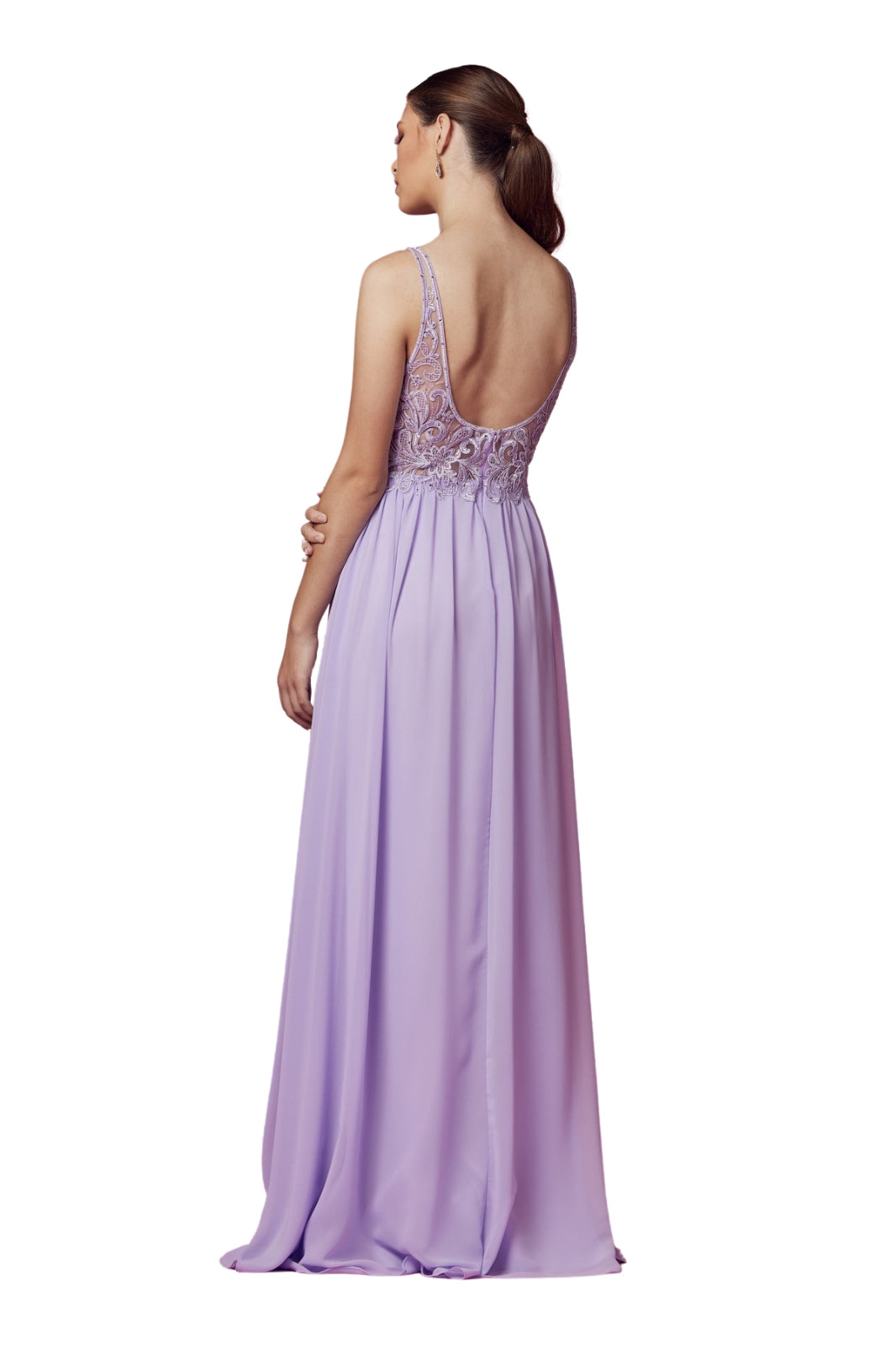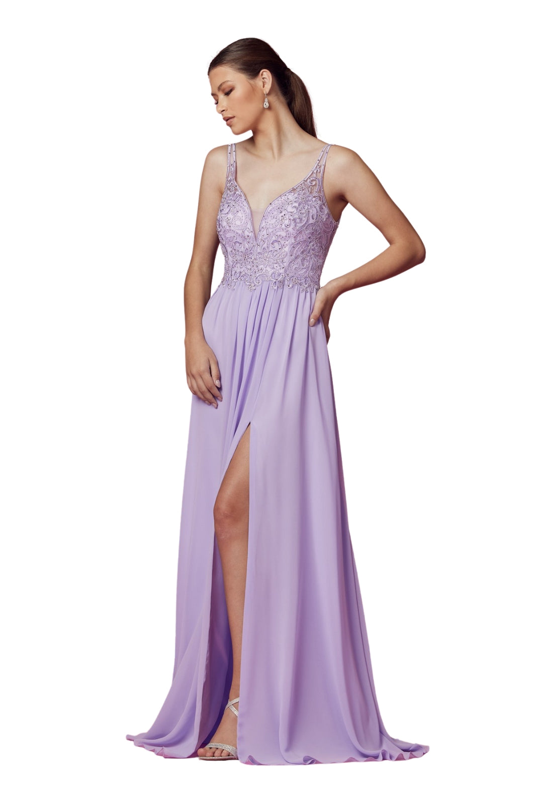 This elegant dress seduces with its delicately embroidered top adorned with lace motifs and its thin straps that frame a plunging neckline. The flowing chiffon skirt falls gracefully, accentuated by a subtle slit on the leg that adds a touch of modernity and sensuality.