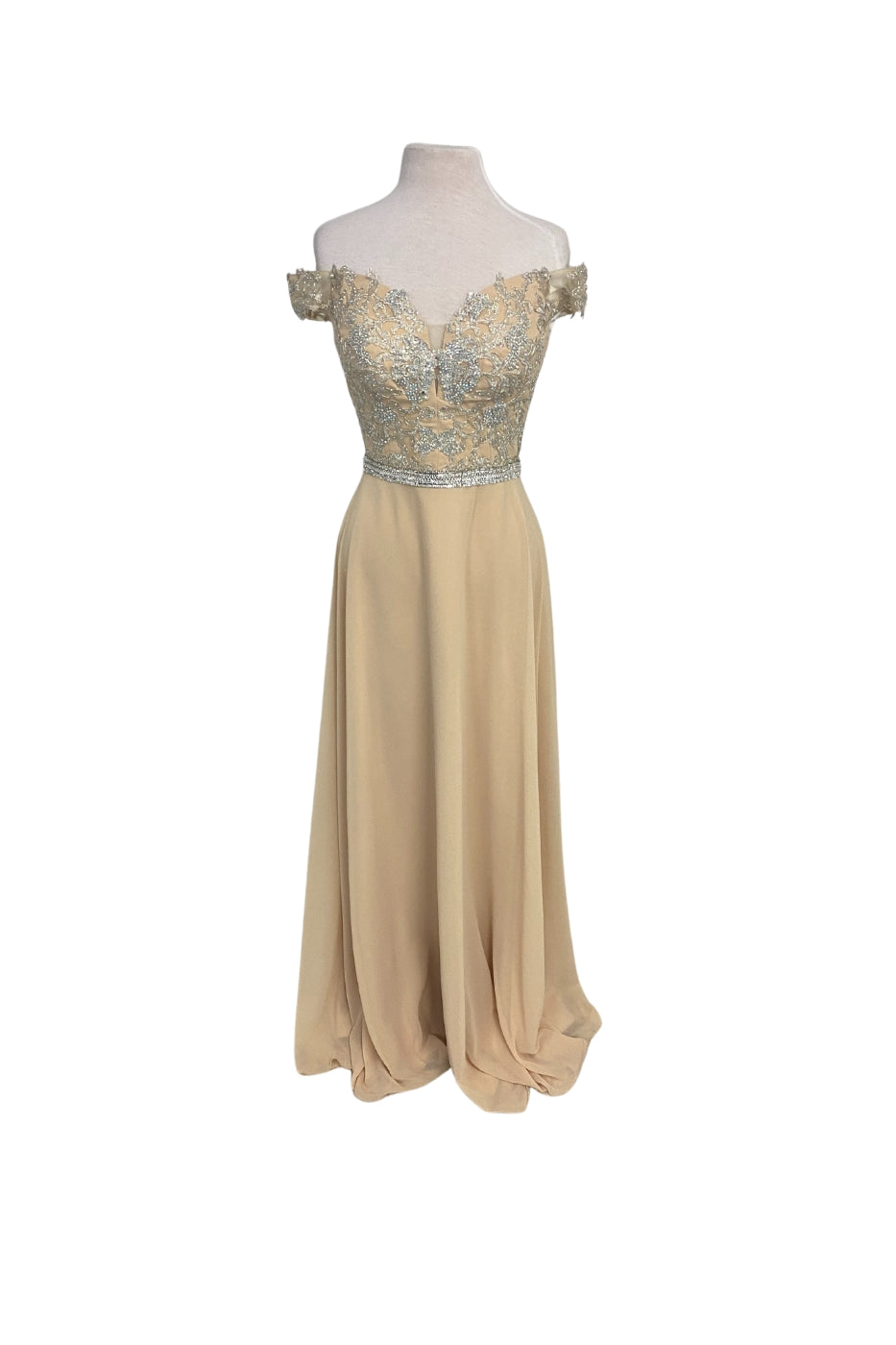 The dress is an exceptional piece designed for glamorous evenings and special occasions. With its bodice finely embroidered with sparkling silver patterns and its bare shoulders, this dress enhances the silhouette with elegance and refinement.