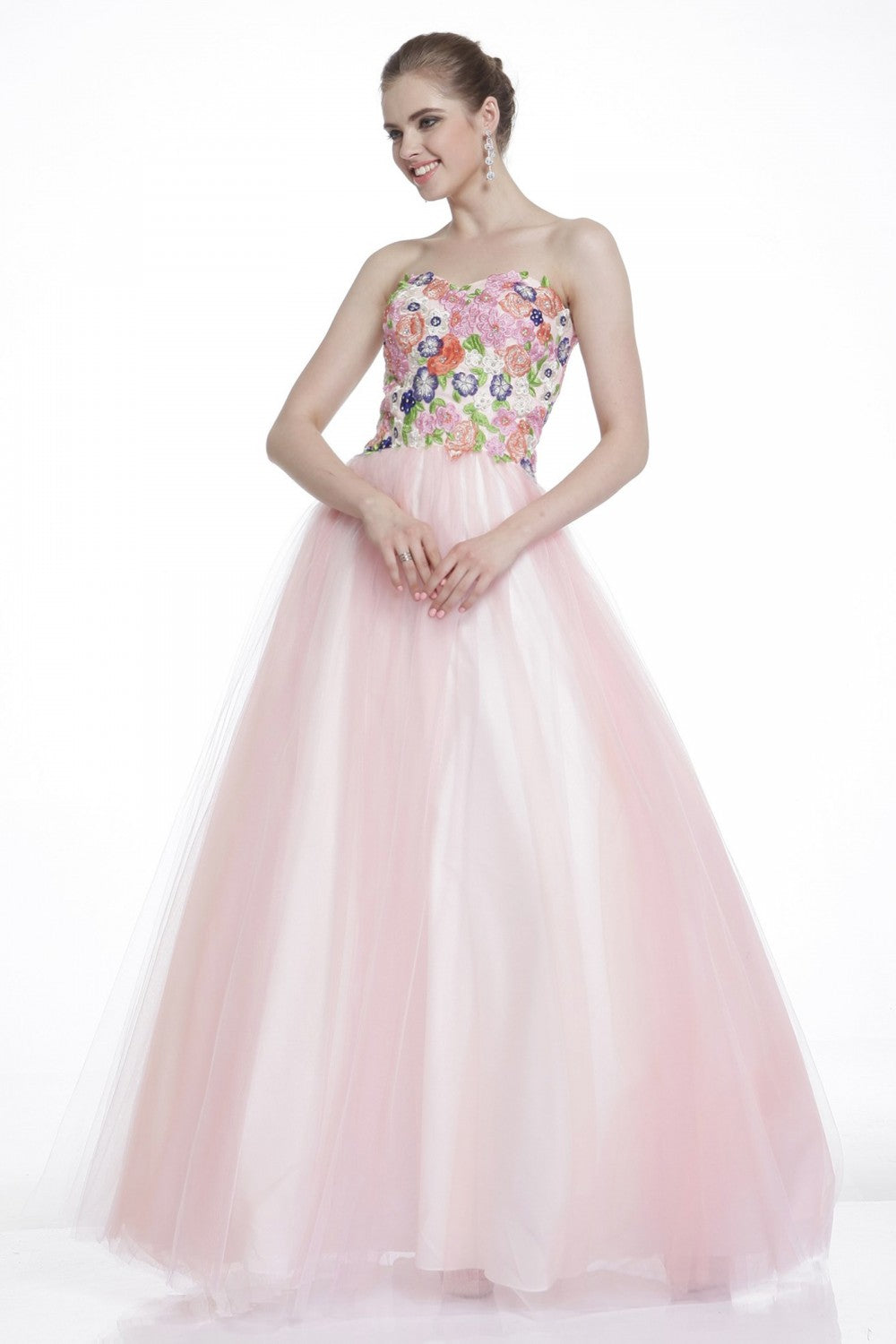 Strapless embroidered ball gown, brightly colored flower appliqué, two shades in tulle |