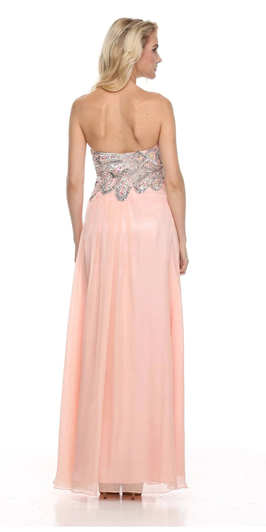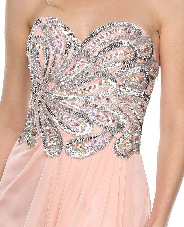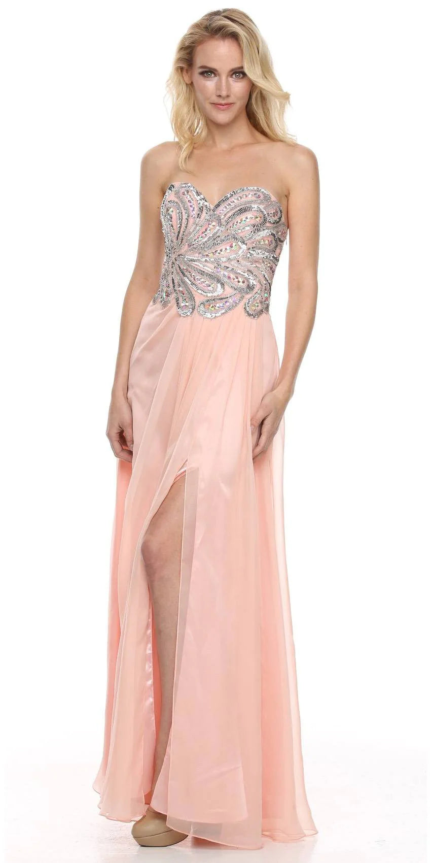 Get ready for a gala dinner wearing this ravishing column gown from Juliet 548. This strapless gown is designed with a sweetheart neckline that shapes the fitted bodice reaching the natural waistline. The bodice is interestingly accented with floral appliques and sequin accents to create a striking design that is its most striking element. A floor-length skirt with an elegant slit completes the design of this beautiful outfit.