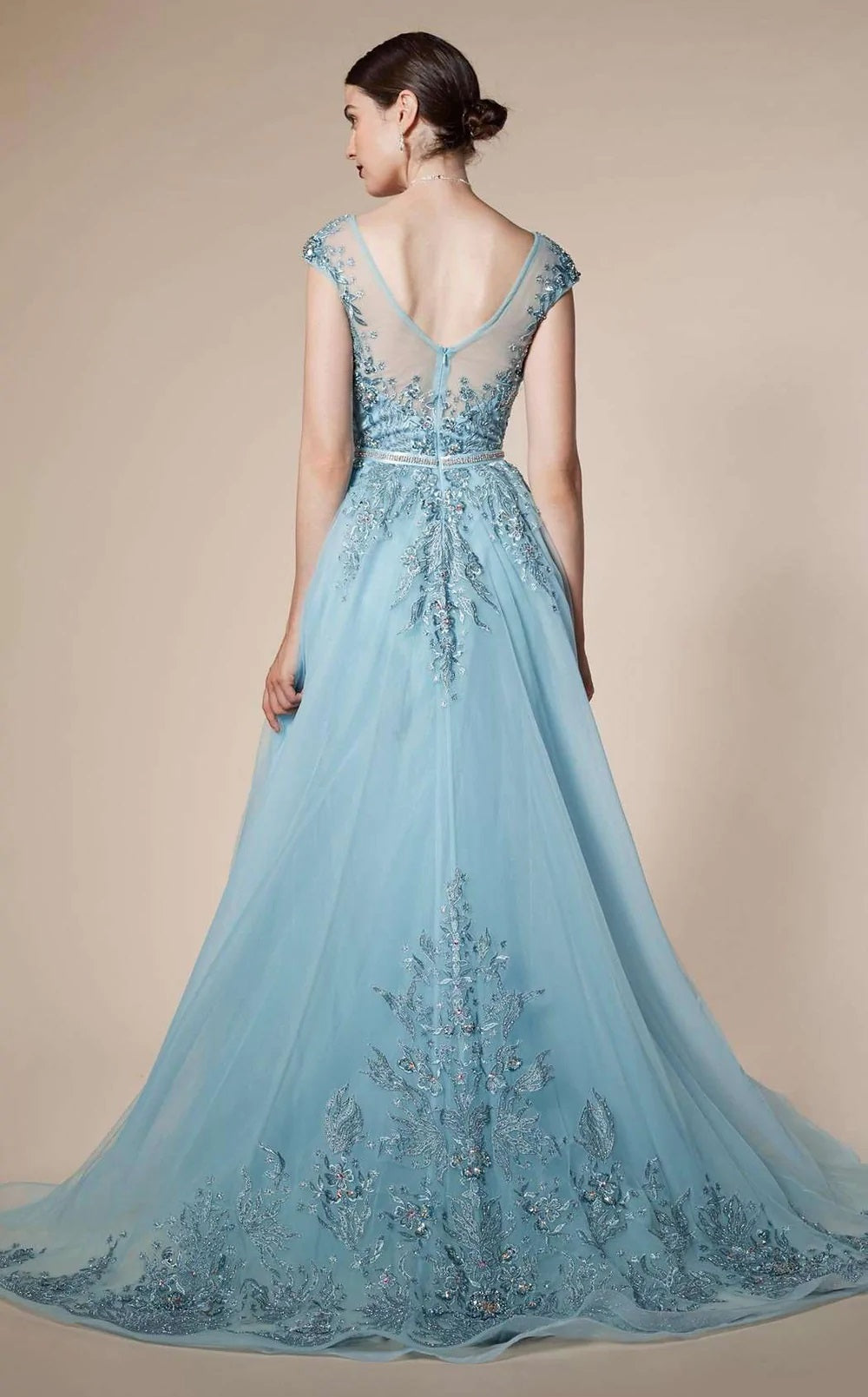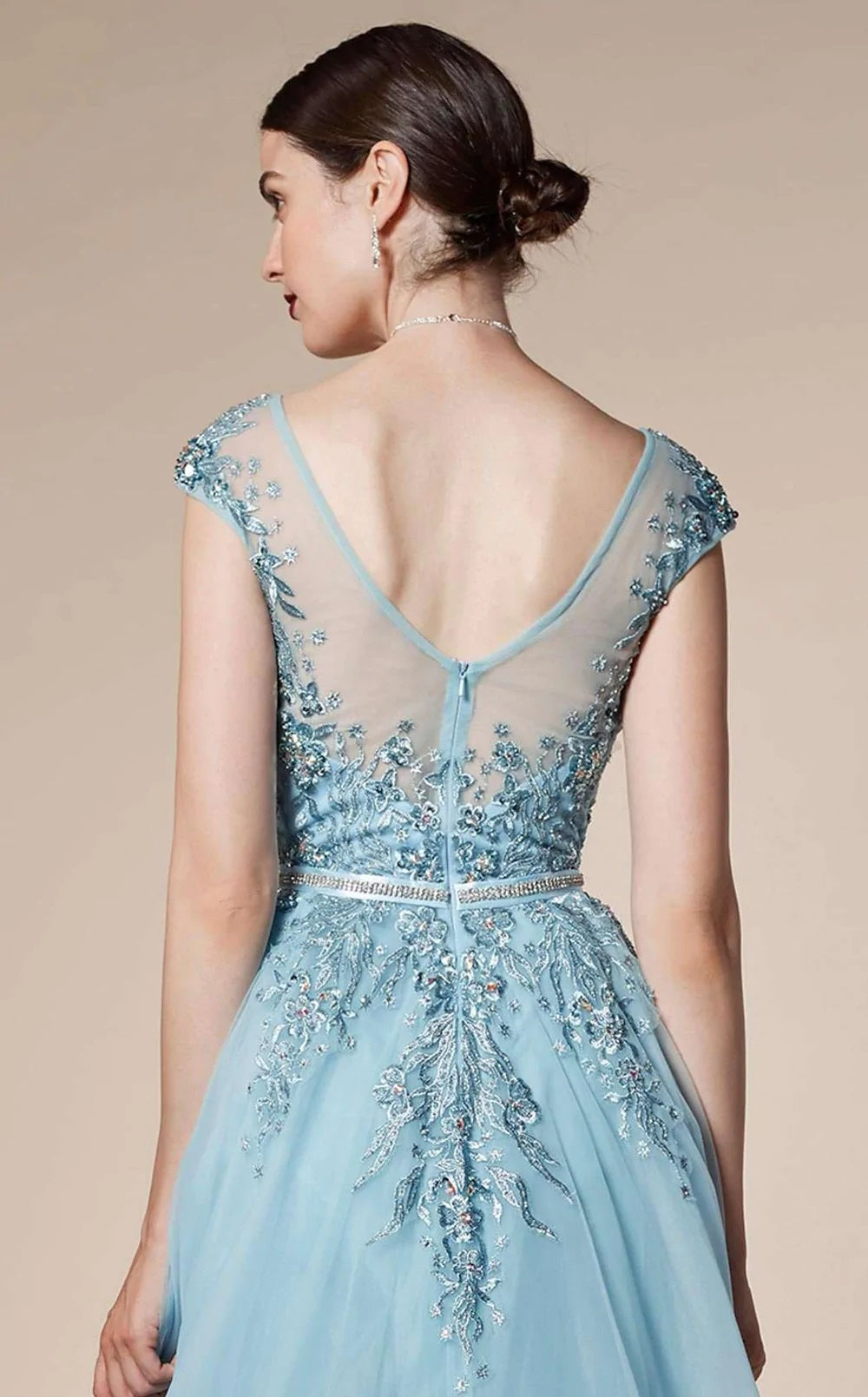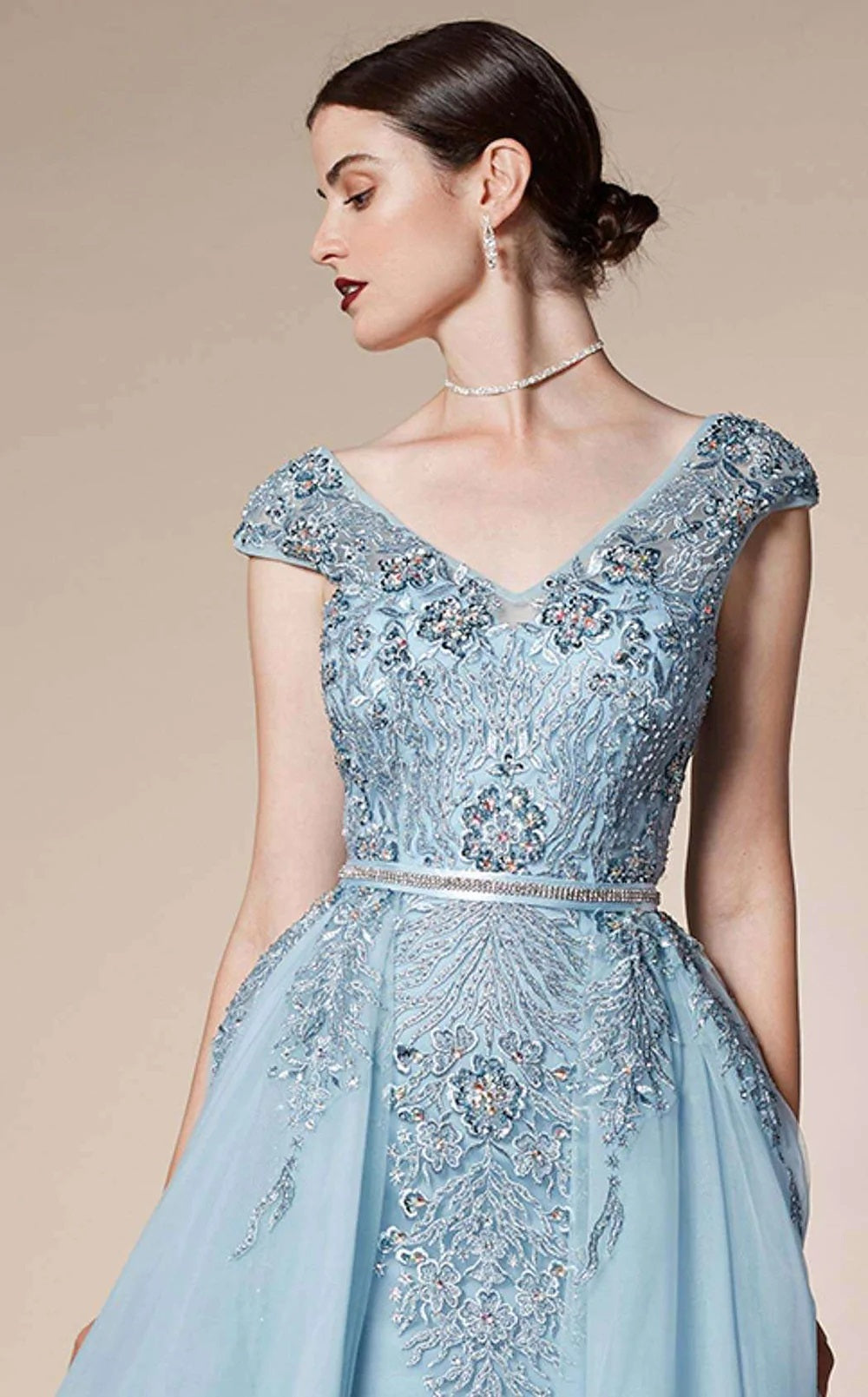 Description: Make a statement in this stunning dusty blue A-line sheath ball gown from Andrea and Leo. Featuring a v-neckline and a bodice covered in an incredible amount of beading and intricate embroidery. A rhinestone embellished waistband defines the natural waistline while the hem flares to the floor on a crinoline ribbon.