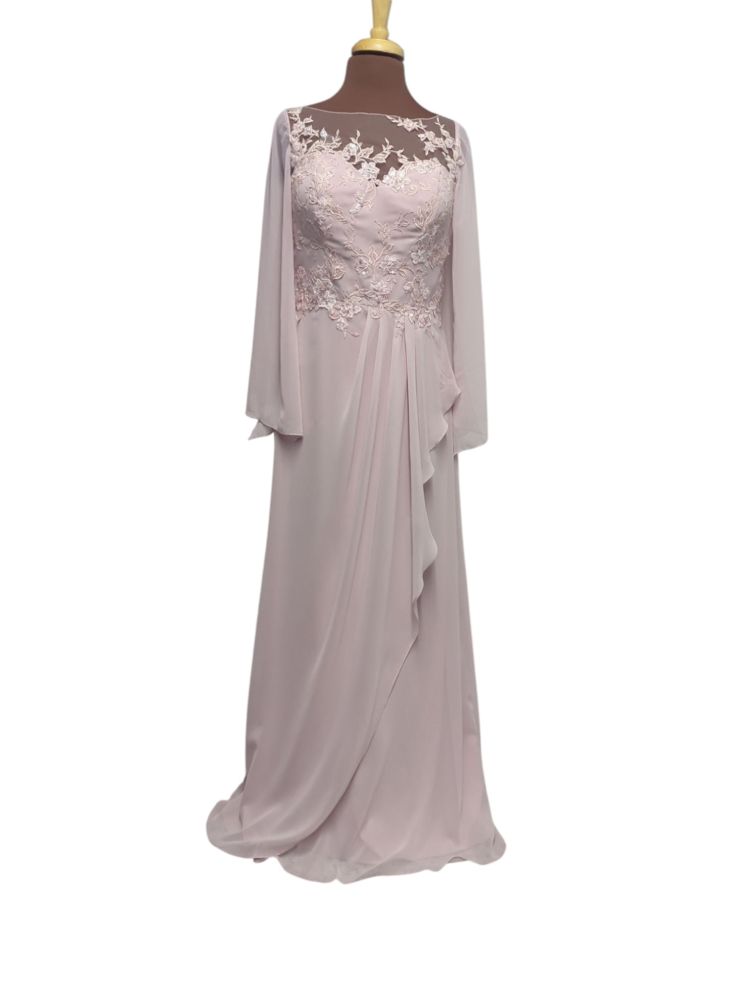La robe M355 incarne la grâce et la féminité avec sa coupe fluide, ses manches longues et son délicat jeu de transparence sur le haut du buste. Sa dentelle florale brodée ajoute une touche romantique et sophistiquée, tandis que le drapé asymétrique à l'avant crée un effet fluide flatteur. Idéale pour les cérémonies, les mariages ou comme robe de mère de la mariée.