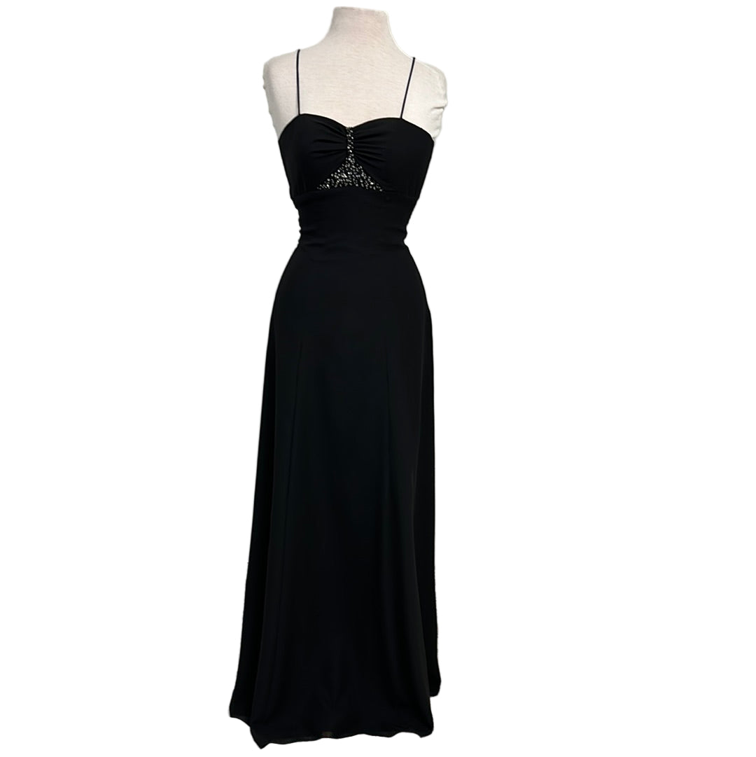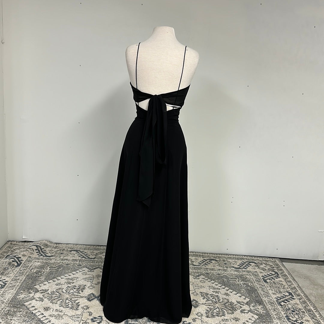 This timeless black dress embodies elegance and simplicity. With a pleated bodice and delicate lace details, it is perfect for any formal occasion. The thin spaghetti straps add a touch of lightness and modernity.