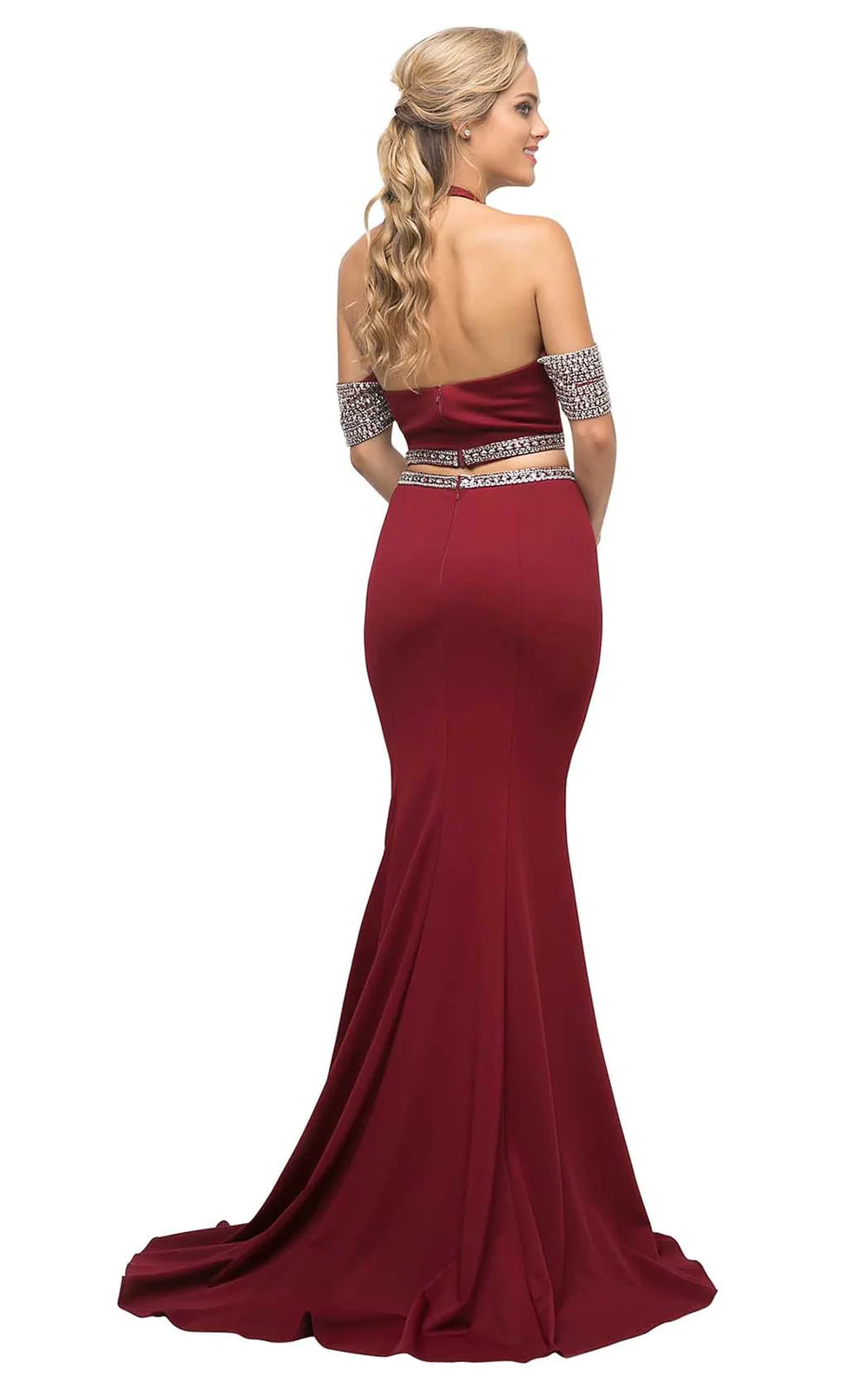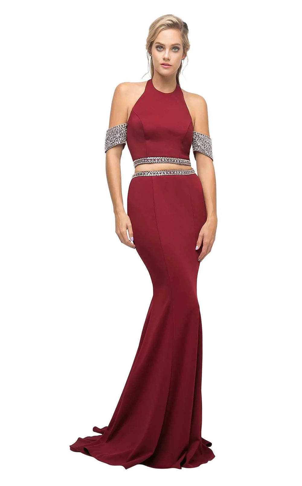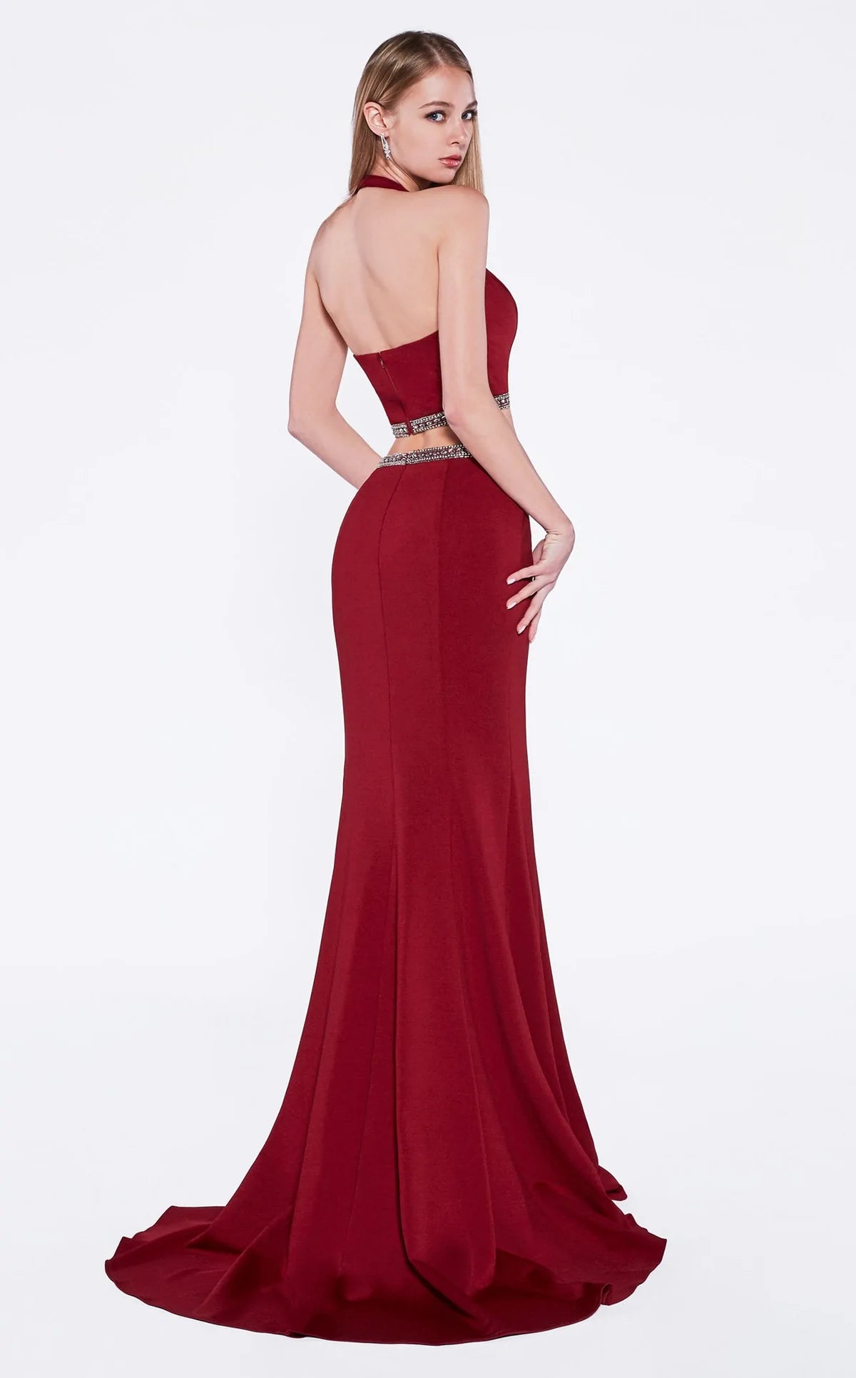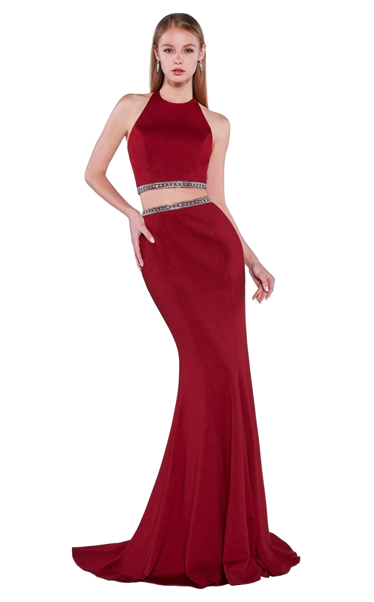 Cinderella Divine's UH551 is a show-stopping two-piece dress, perfect for a modern and bold look. This design features a fitted crop top with a high neckline and sparkling gemstone detailing at the waist. The mermaid skirt elegantly accents your curves, while the glitter accents add an irresistible touch of glamour.