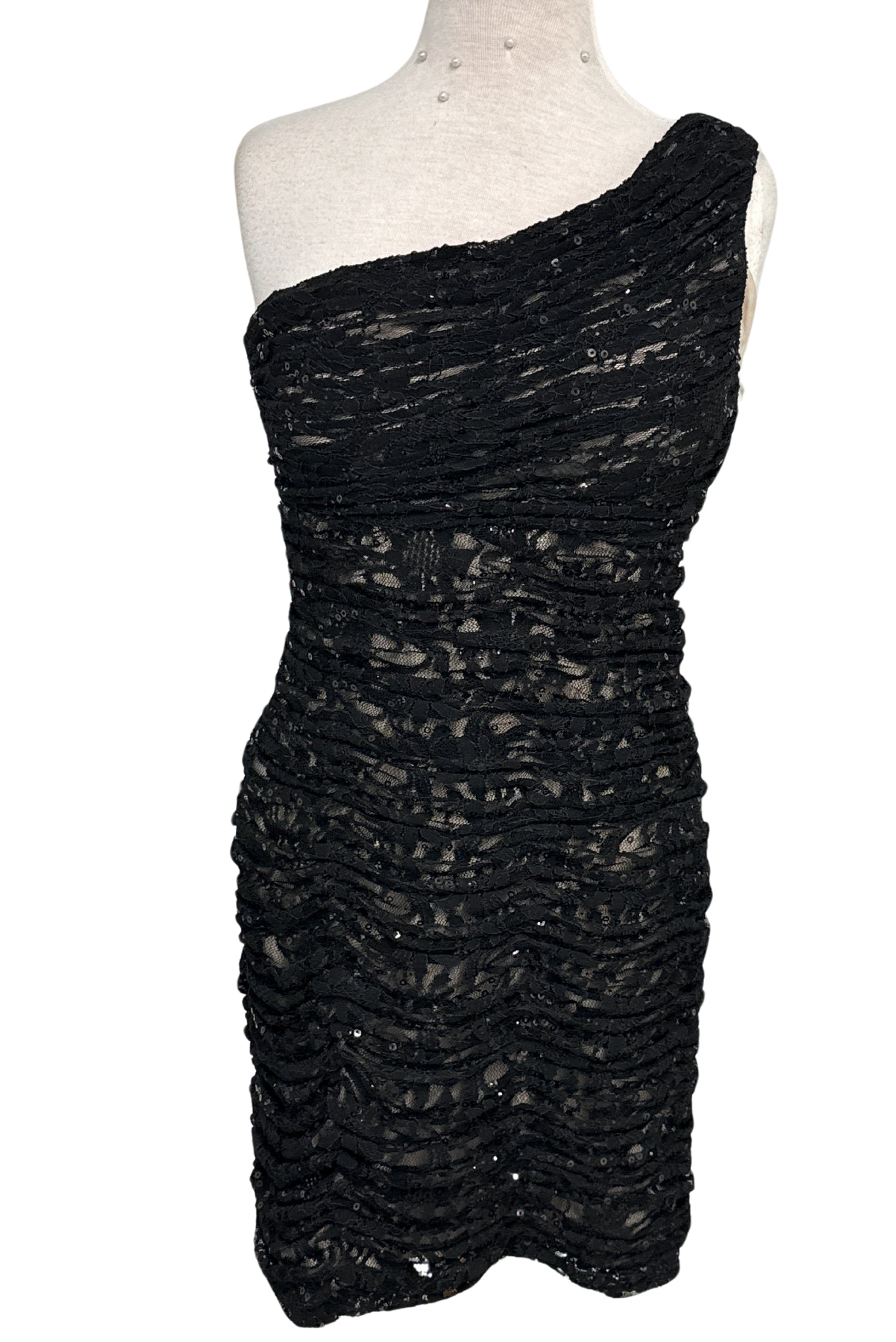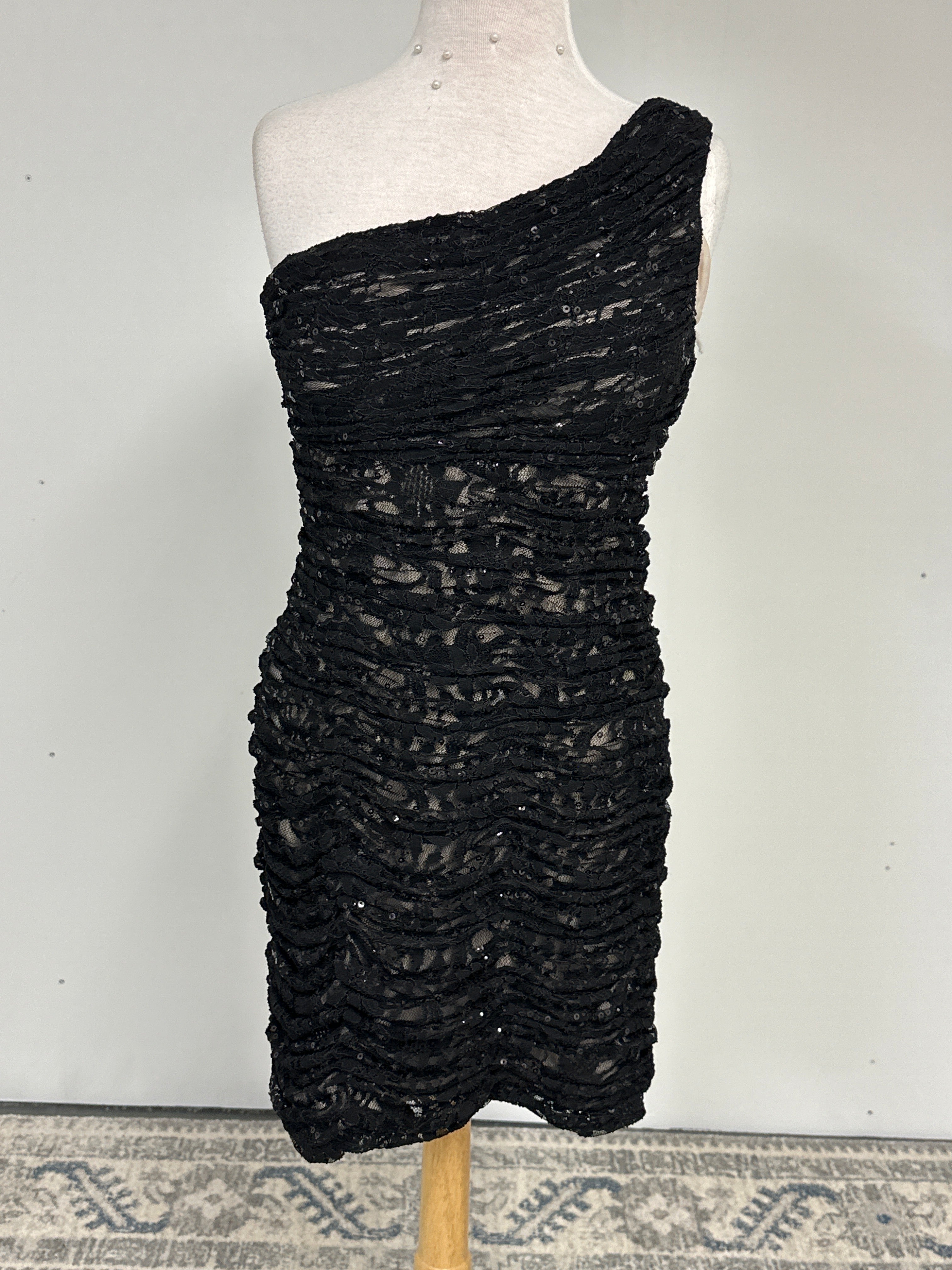 This black short dress embodies elegance with a modern touch thanks to its asymmetrical cut and sparkling lace details. Perfect for chic evenings, it offers a balance between sophistication and glamour.