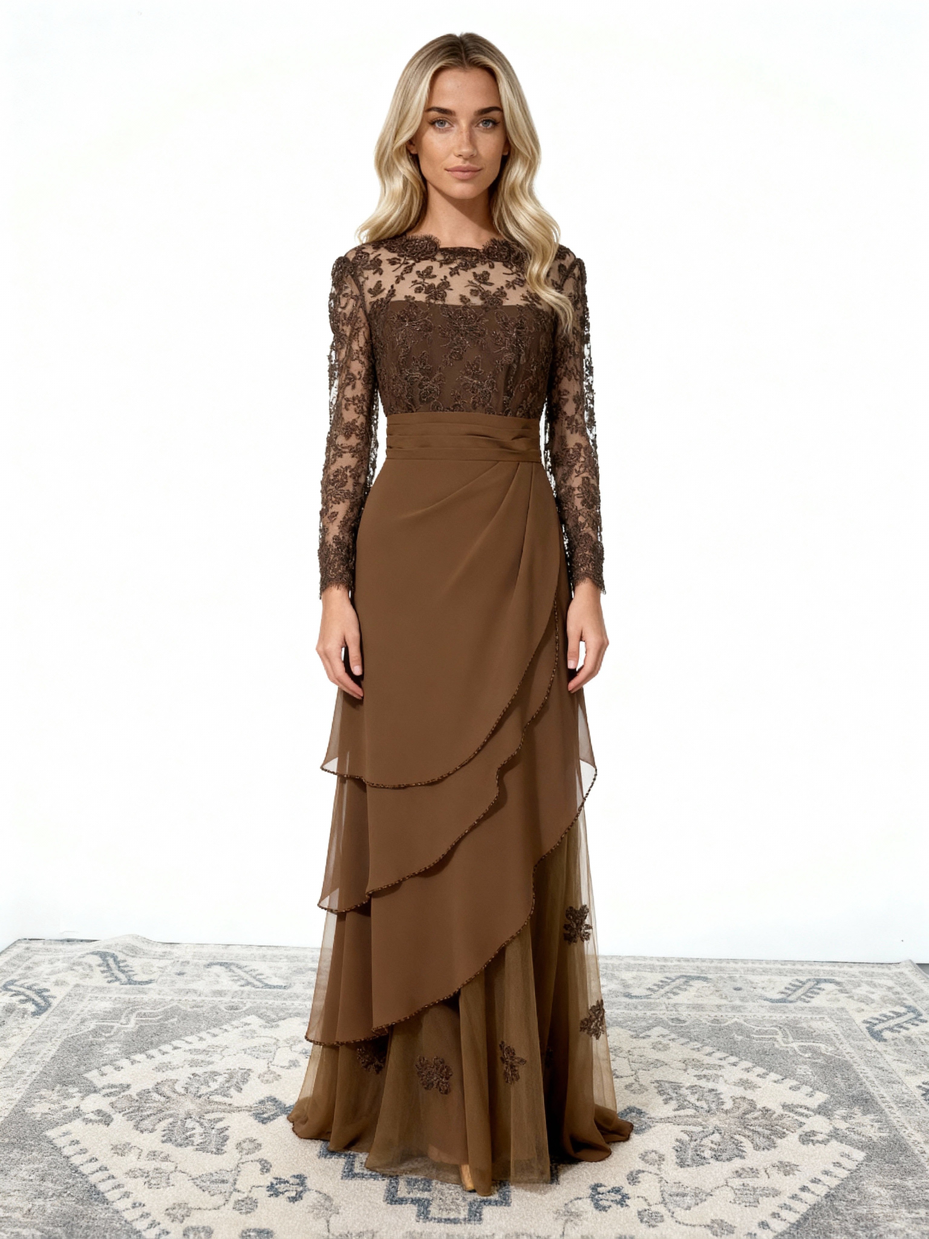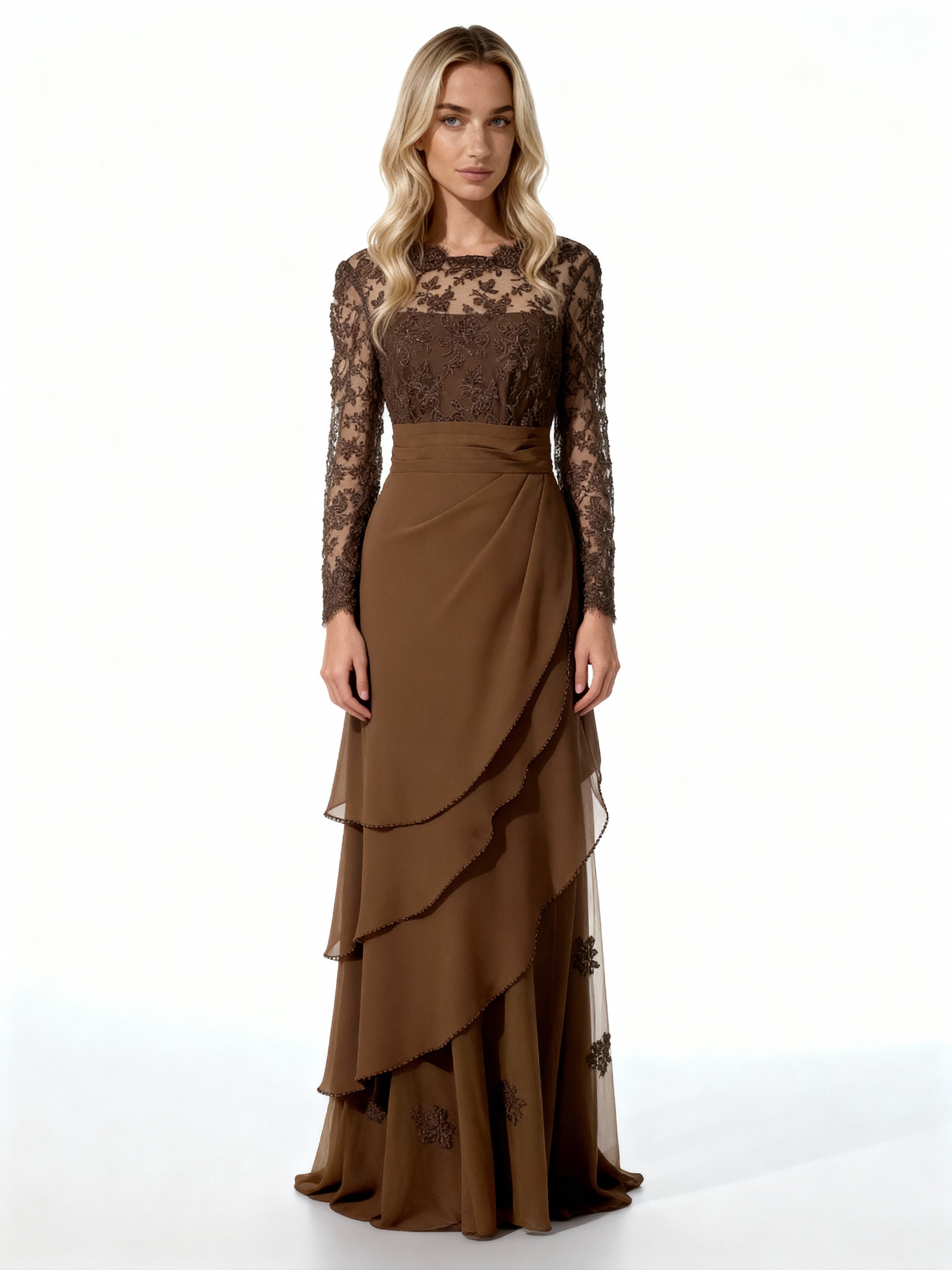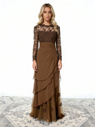 This sumptuous brown lace and chiffon maxi dress is designed to bring a touch of timeless elegance to any special occasion. Its upper part is made of sheer lace, adorned with intricate embroidery that brings a refined contrasting effect. The chiffon skirt is draped in flowing layers, creating graceful movement with every step.