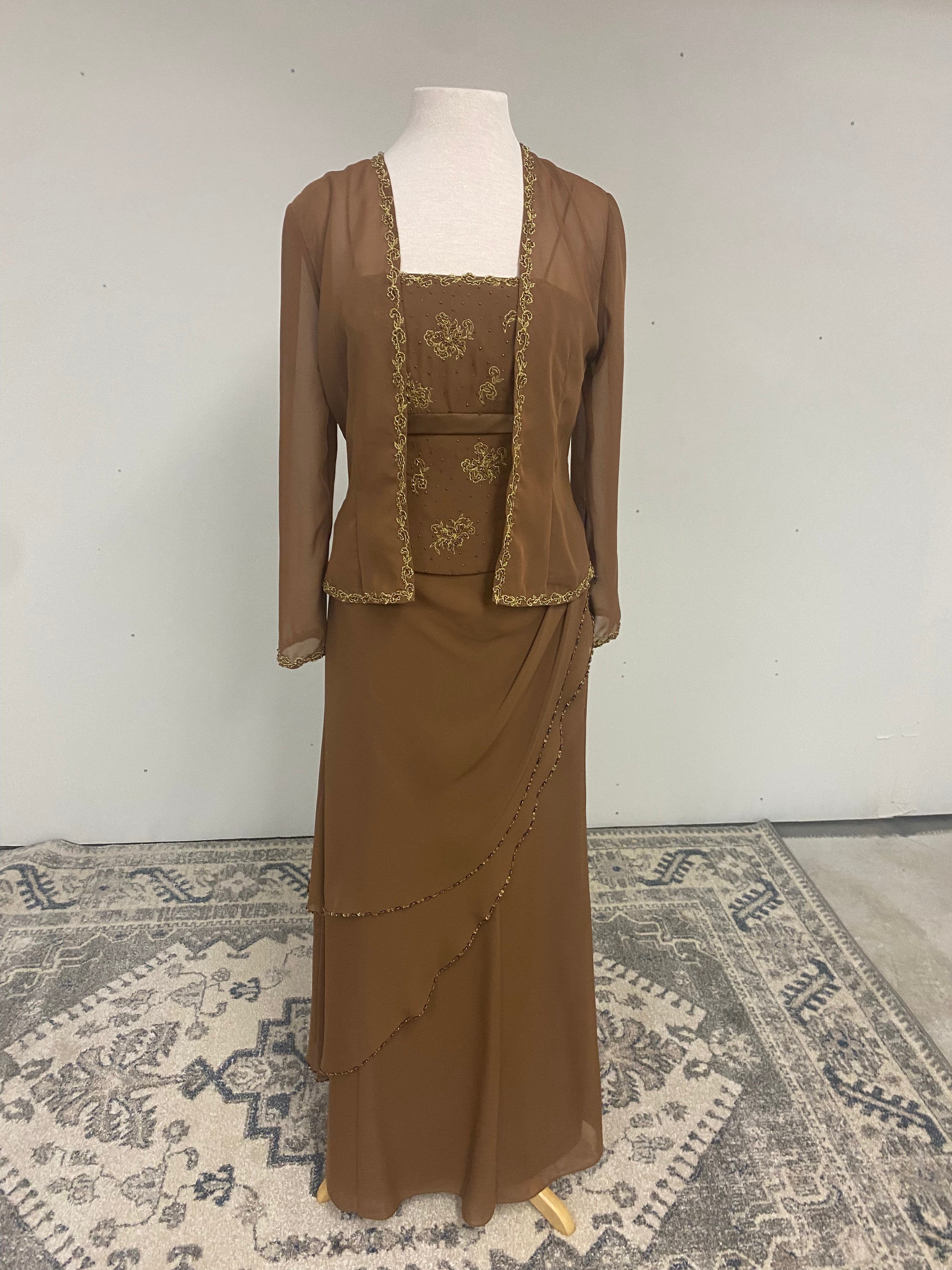 Draped Dress Set with Transparent Jacket and Gold Embroidery