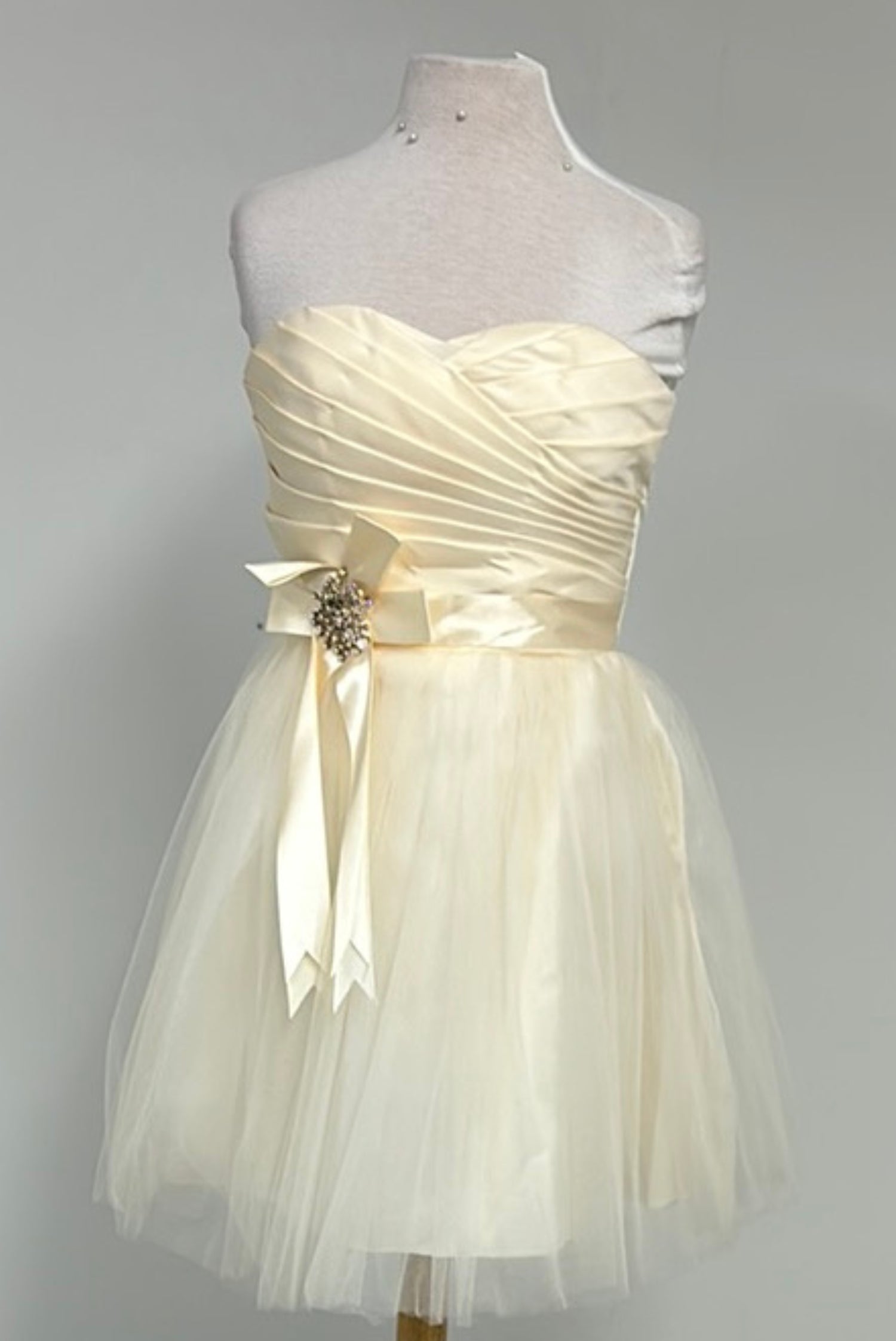 This charming short tulle strapless dress combines romance and elegance. Ideal for a reception or special event, it features a draped bodice and a belt adorned with an elegant brooch.