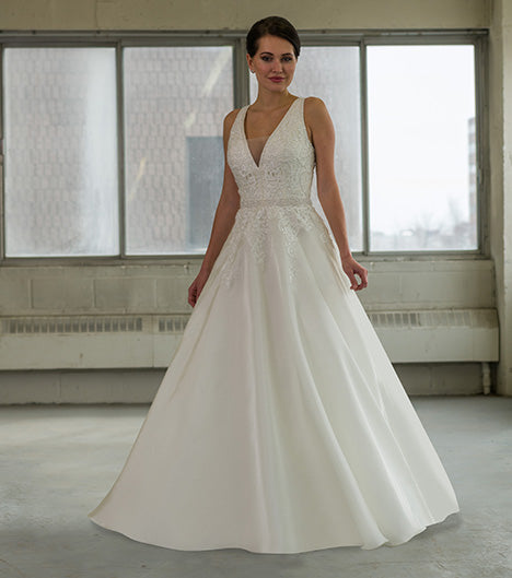 Description: Beaded lace and silk organza wedding dress, neckline with sheer center panel and sheer back with embroidered motif.