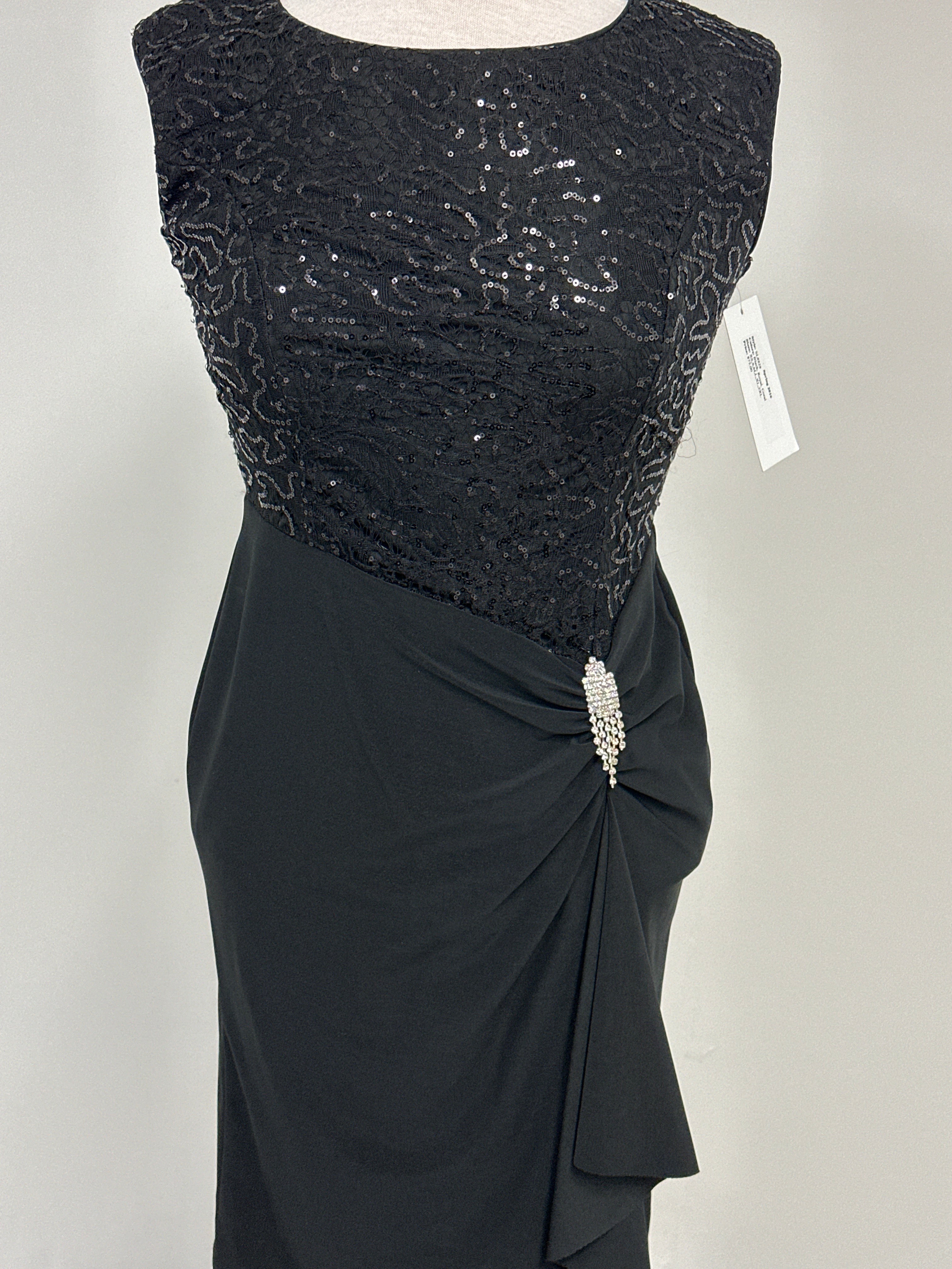 Description: Treat yourself to a sophisticated look with the SL8828 dress. Its fitted cut in black enhances your figure while the delicate lace and payette top brings a touch of luxury. The small rhinestone brooch at the bottom of the dress adds an exclusive note to this mid-length dress.