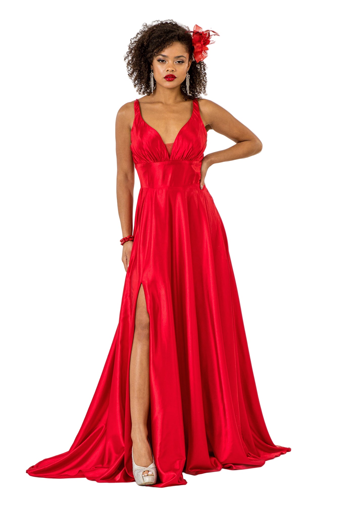 A-Line Satin Long Dress with Wide Waist and Slit |