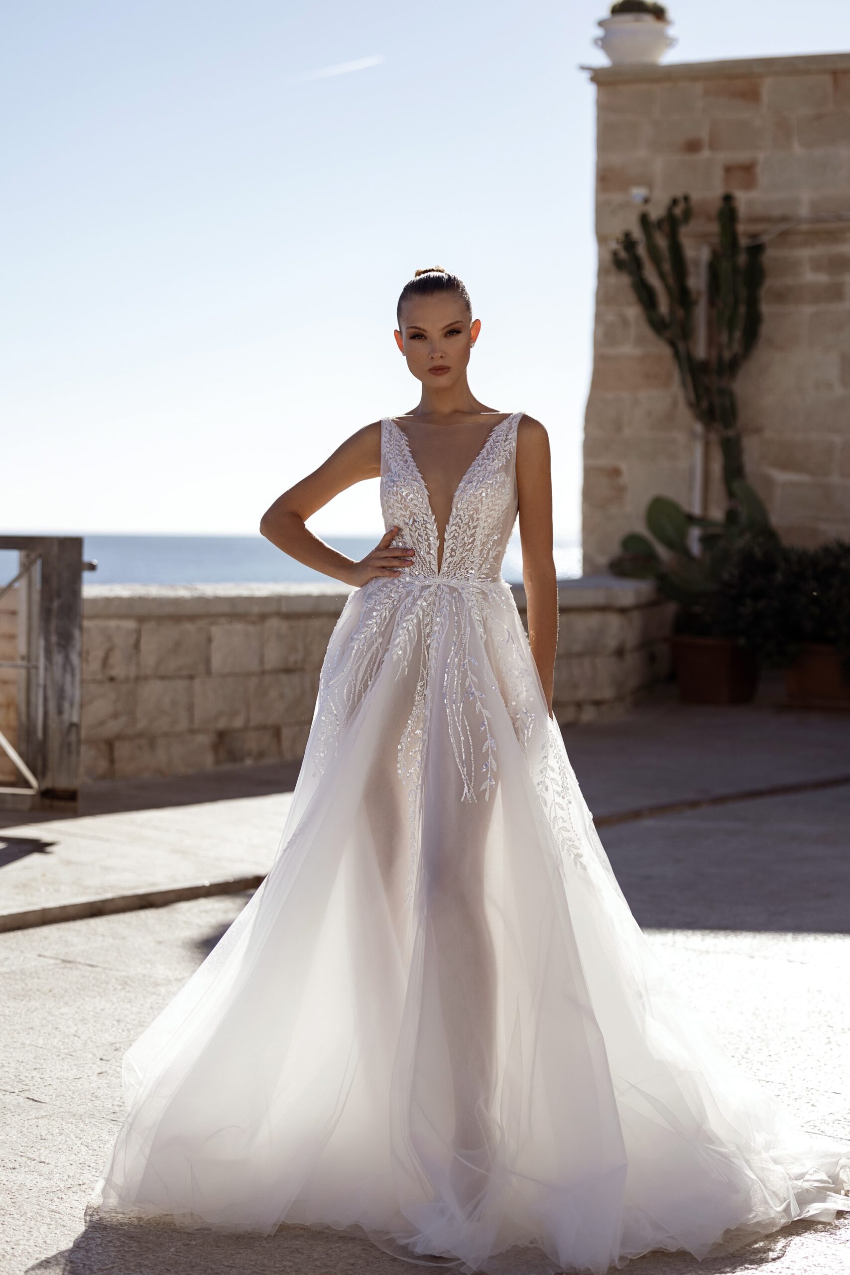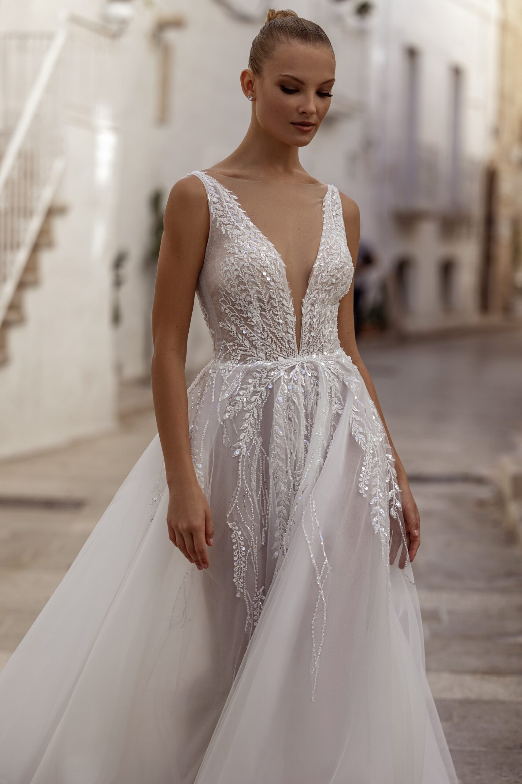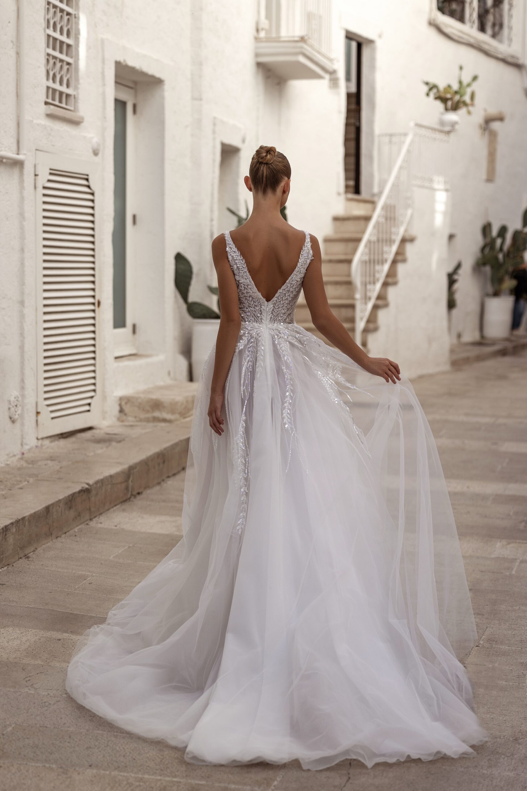 This elegant embroidered tulle wedding dress is a true masterpiece of glamour and finesse. With a fitted bodice and plunging neckline, this dress is designed to enhance the bride's figure while offering a modern and sophisticated touch. The shimmering embroidery details add a touch of magic to every movement, capturing the light in a sublime way. The voluminous tulle skirt, light and flowing, gives a royal allure, perfect for a luxurious wedding by the sea or in a romantic setting.