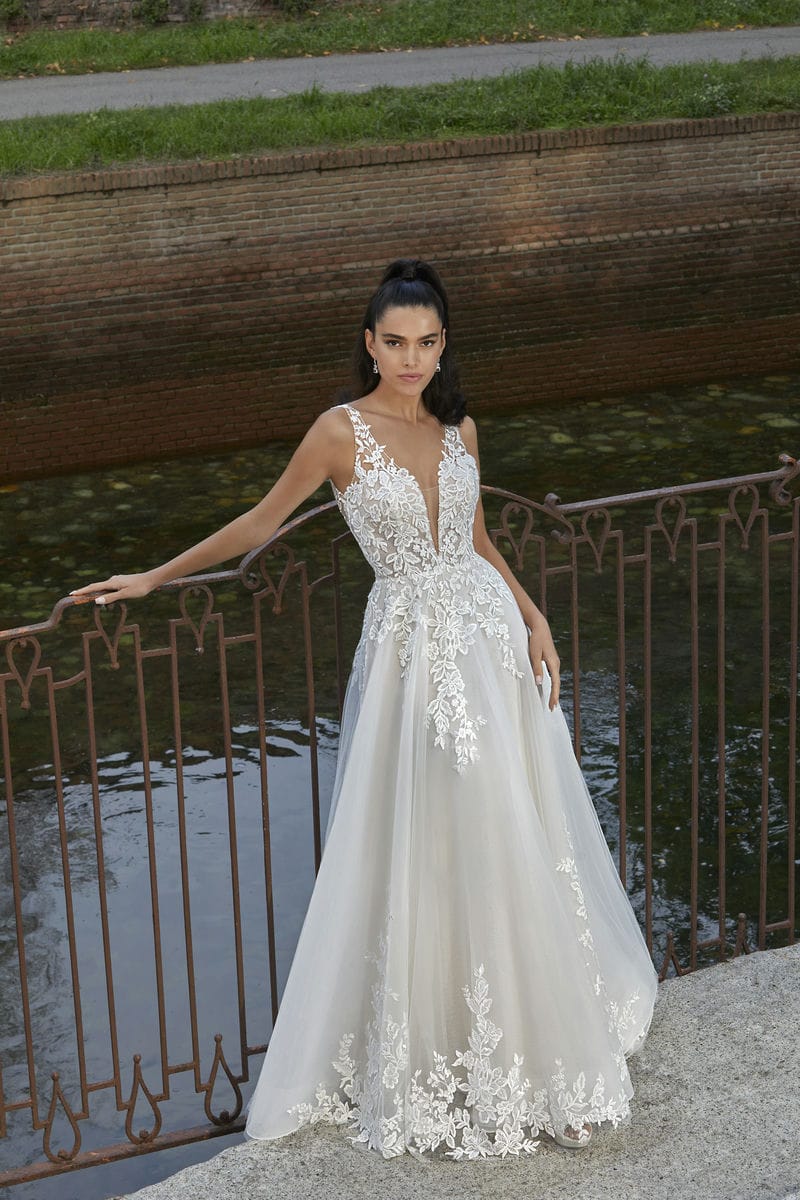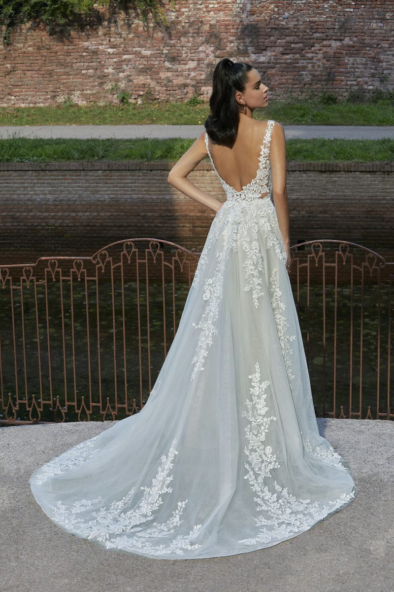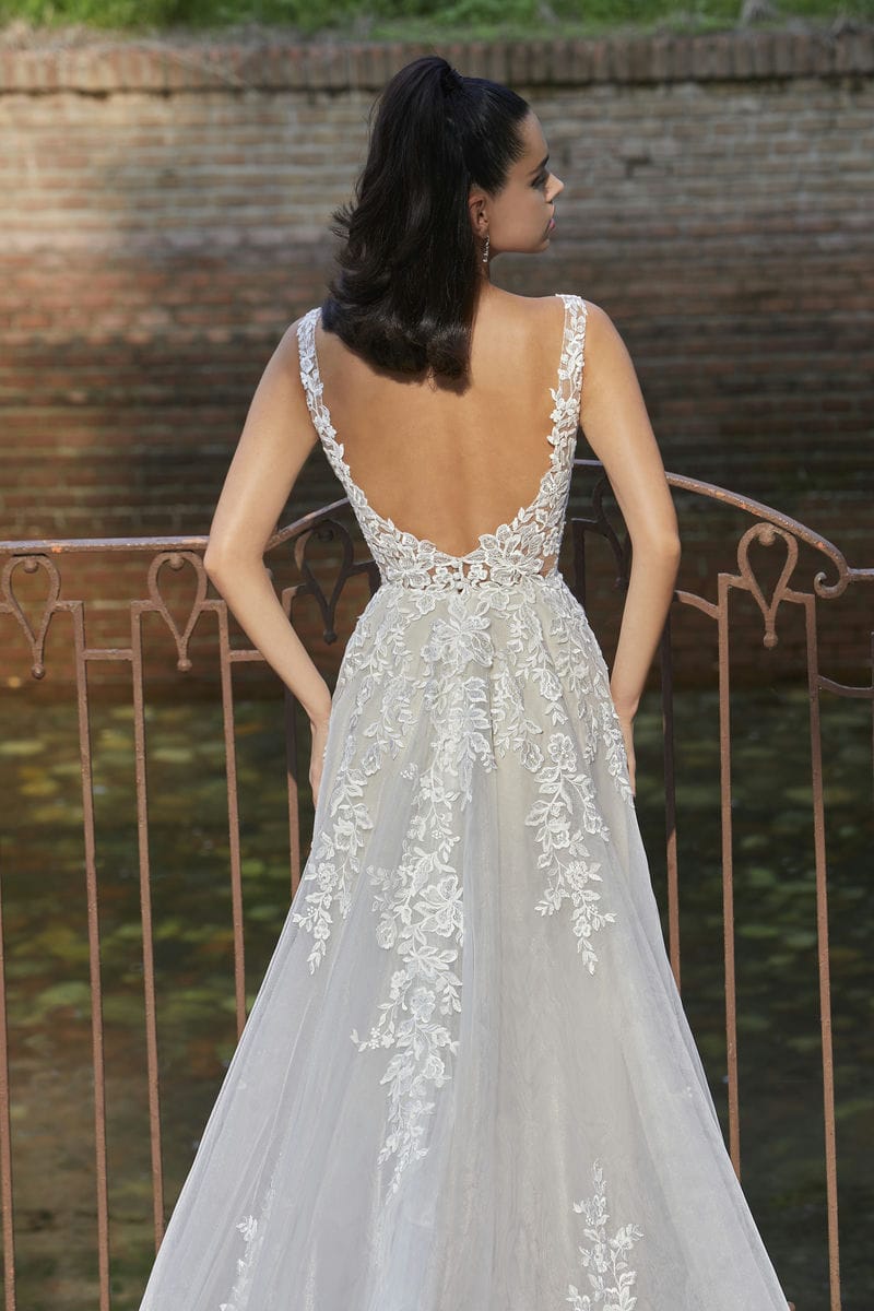 Description: A classic, ethereal design fused with contemporary elements, the Veronique gown style features a plunging V-neck strappy bodice with sheer accents. Exquisite embroidered floral lace blooms throughout the bodice and cascades into the luxurious, lightweight tulle skirt and train.