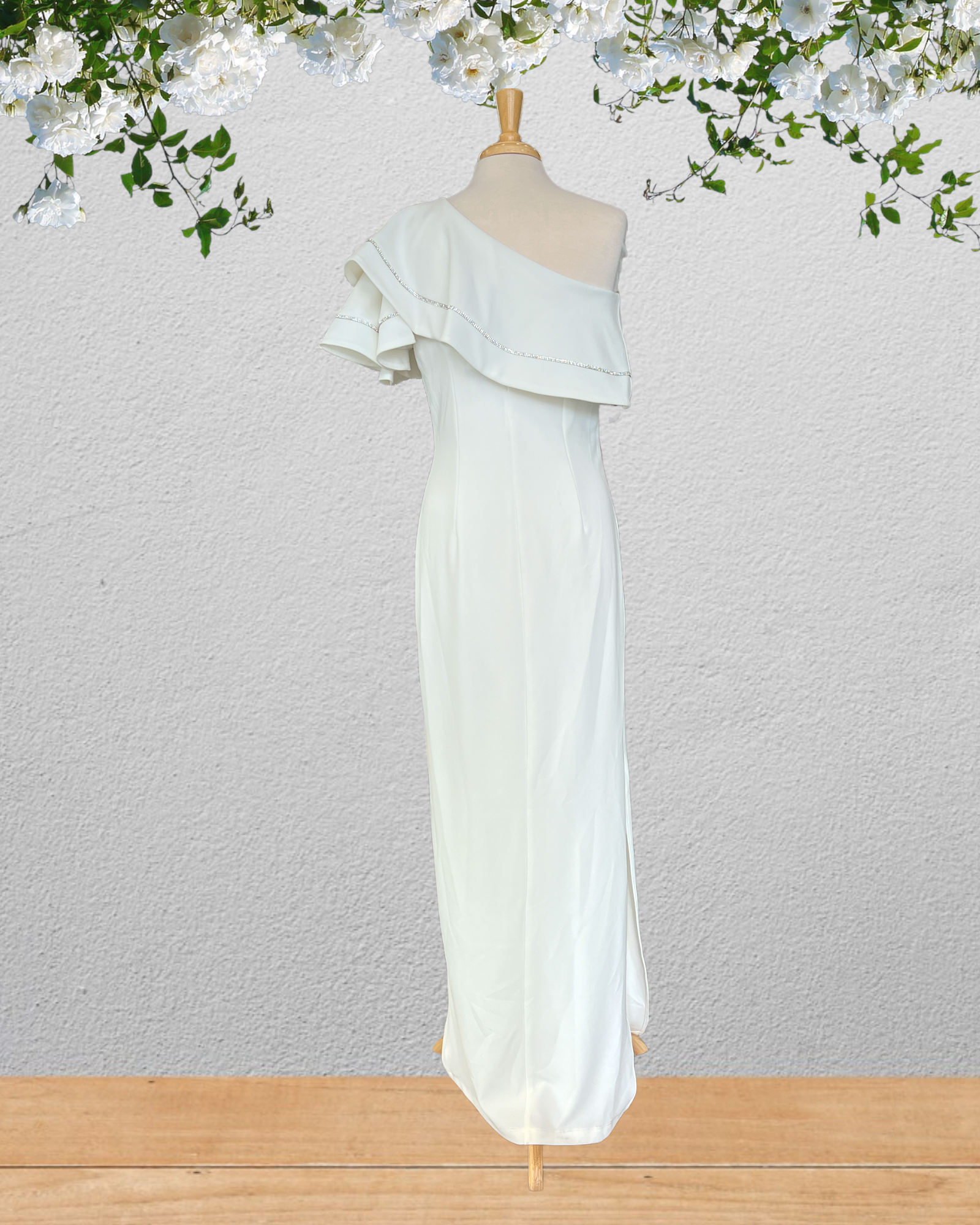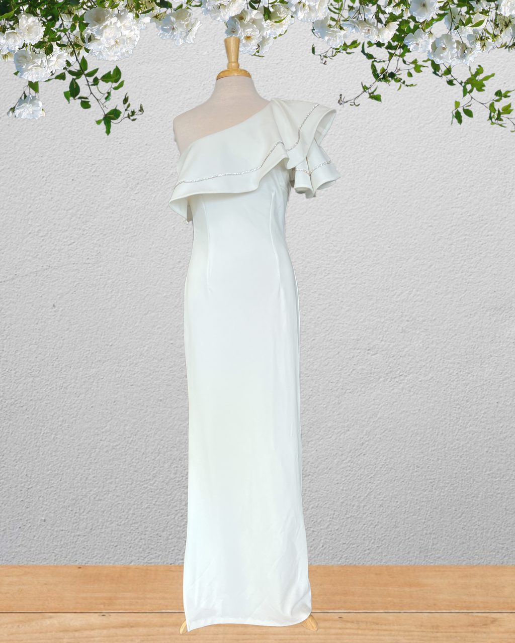 Description: Black dress with asymmetrical shoulder and side slit trimmed with rhinestone-trimmed ruffle