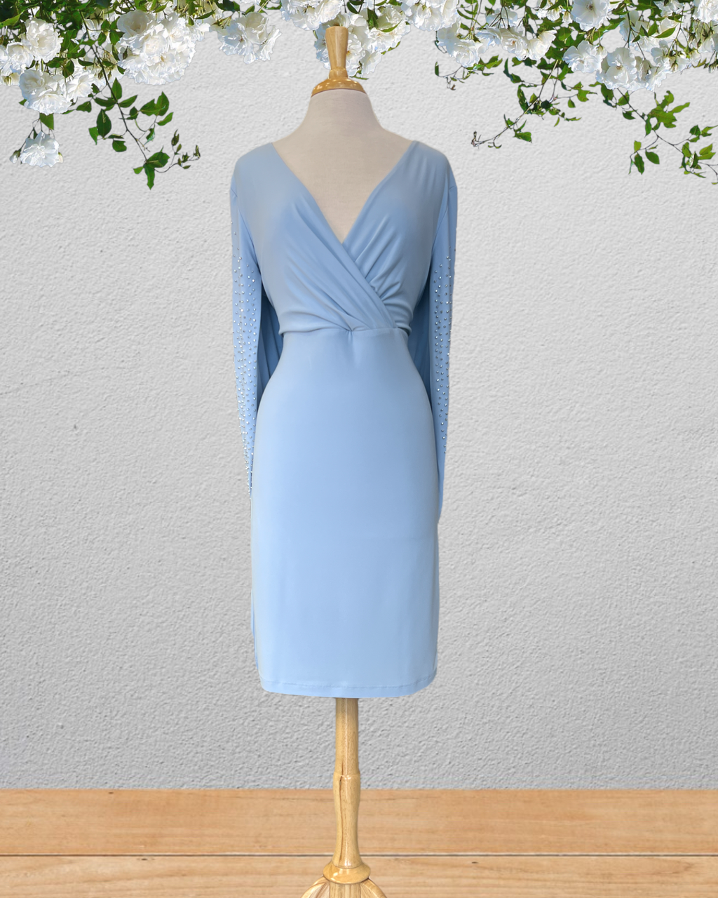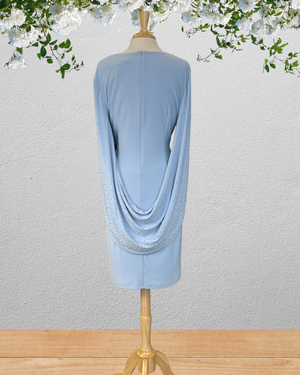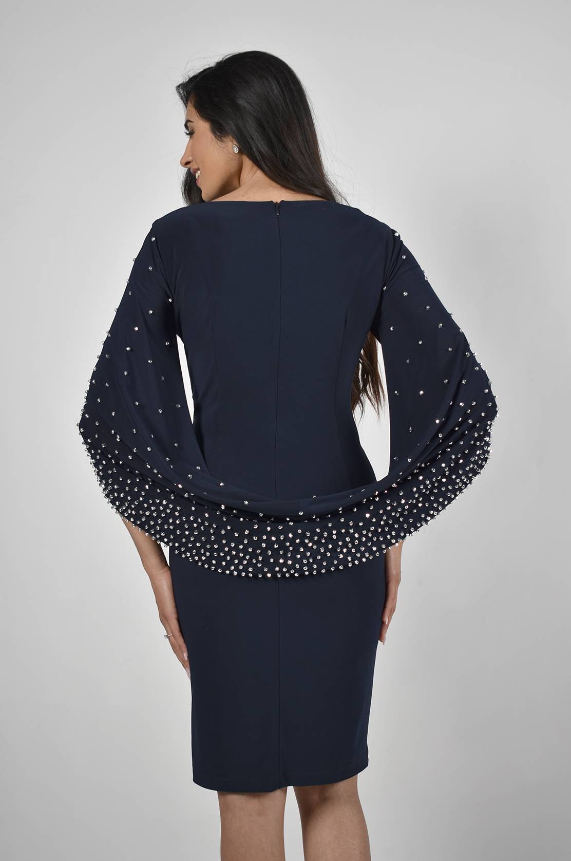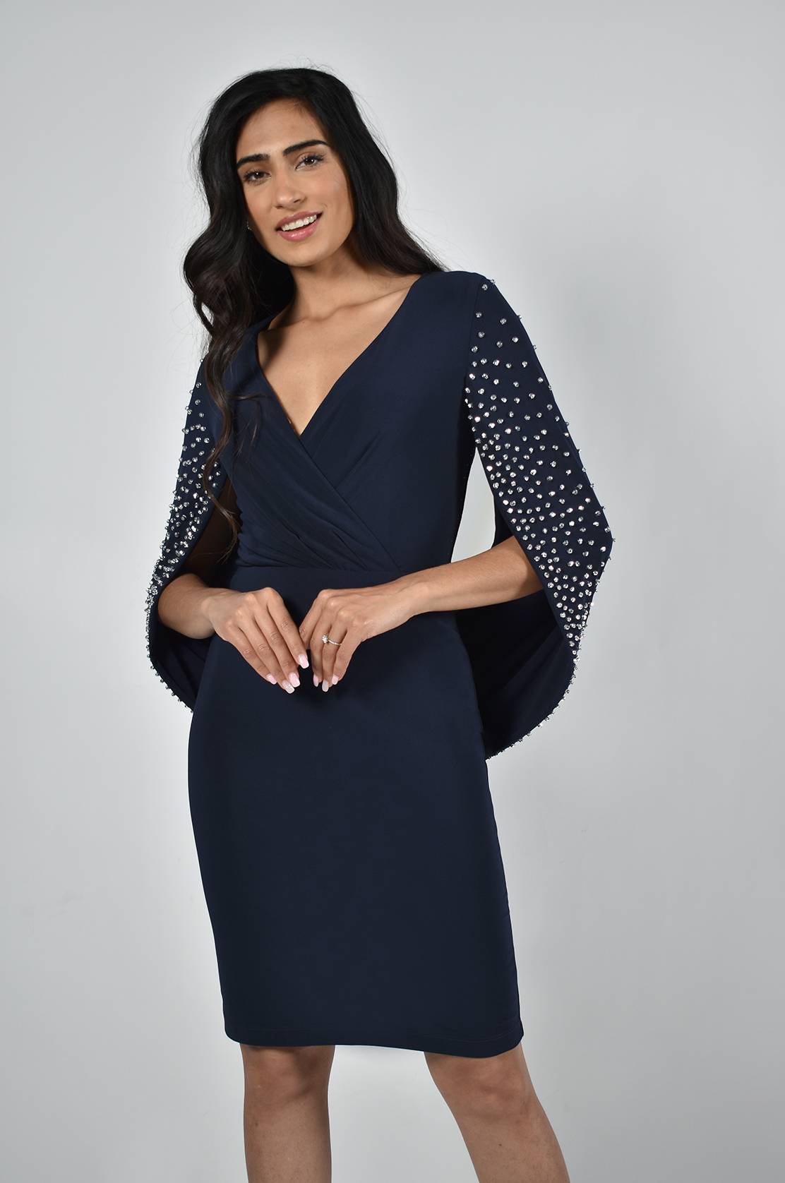 Midnight V-neck dress with a beaded and draped cape effect back.
