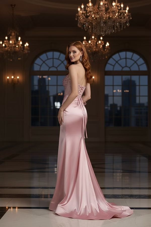 Optez pour des accessoires métallisés assortis à la couleur choisie : argent pour le bleu et le noir, doré pour le champagne et le rose. Une coiffure ondulée ou semi-attachée mettra en valeur le décolleté sans bretelles. Des sandales délicates finaliseront parfaitement la silhouette.
