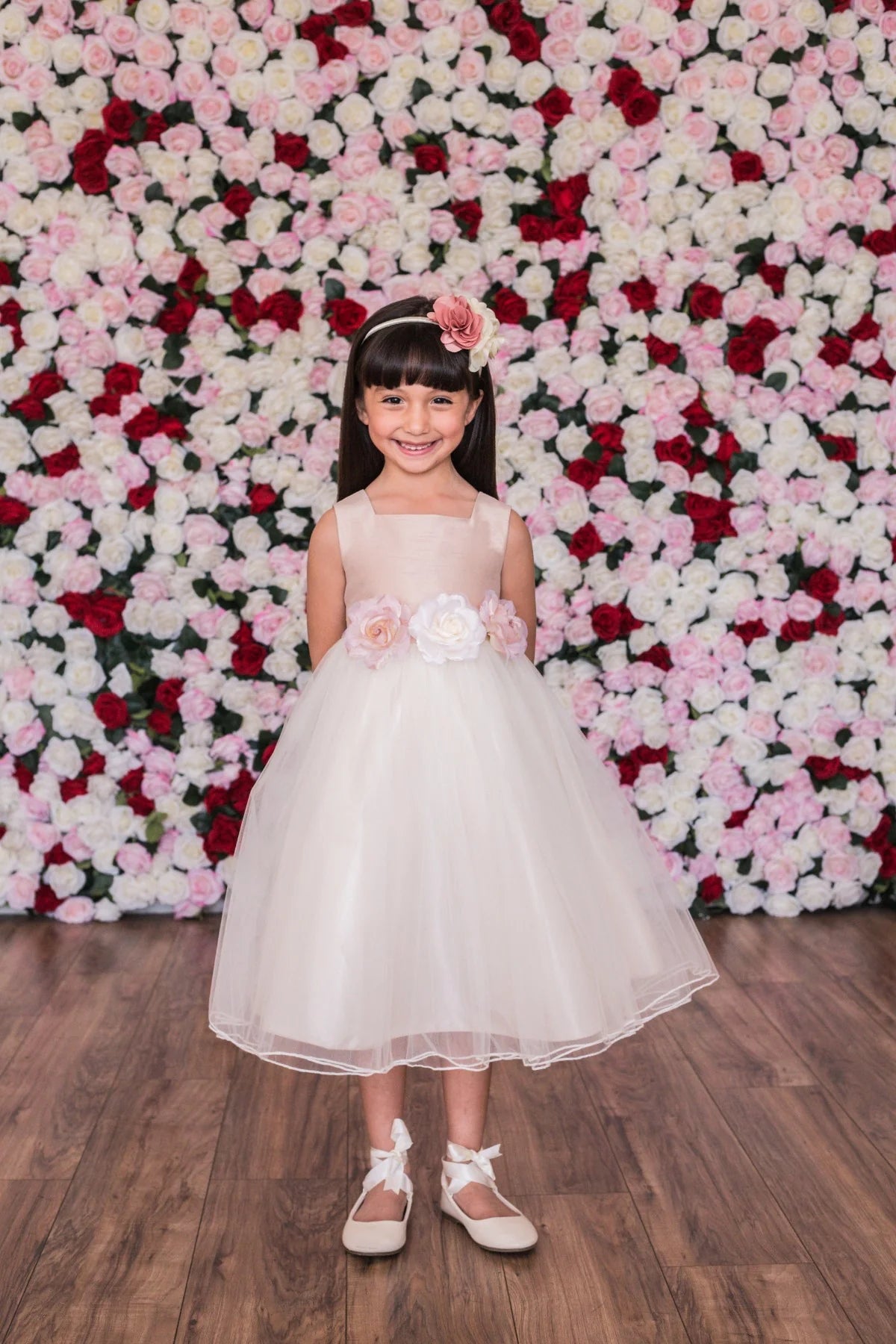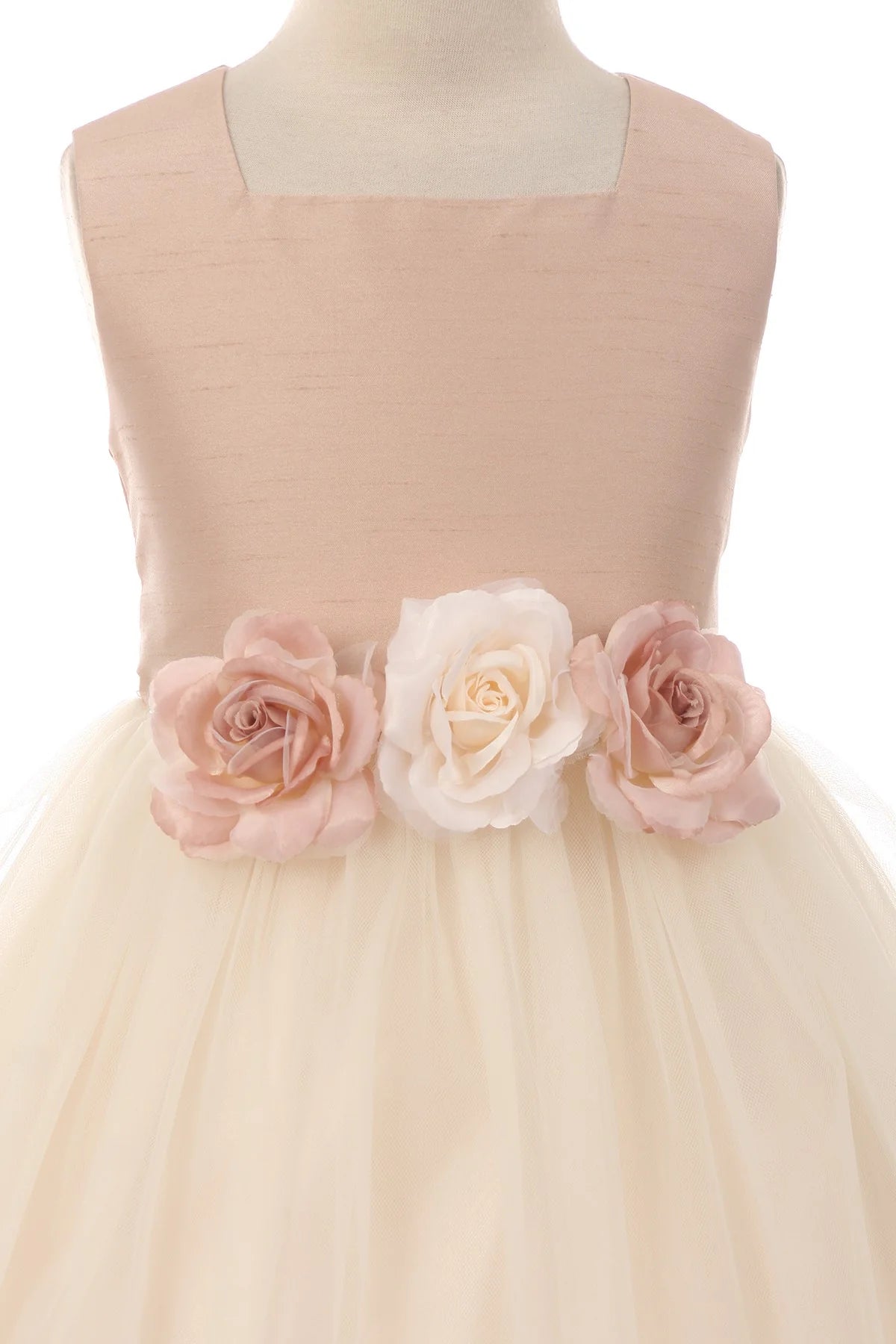 Classic flower girl dress with a square neckline Elizabeth satin bodice. Elizabeth satin has the look of raw silk. The skirt has layers of tulle and comes with three elegant flowers at the waist. The flowers are detachable.