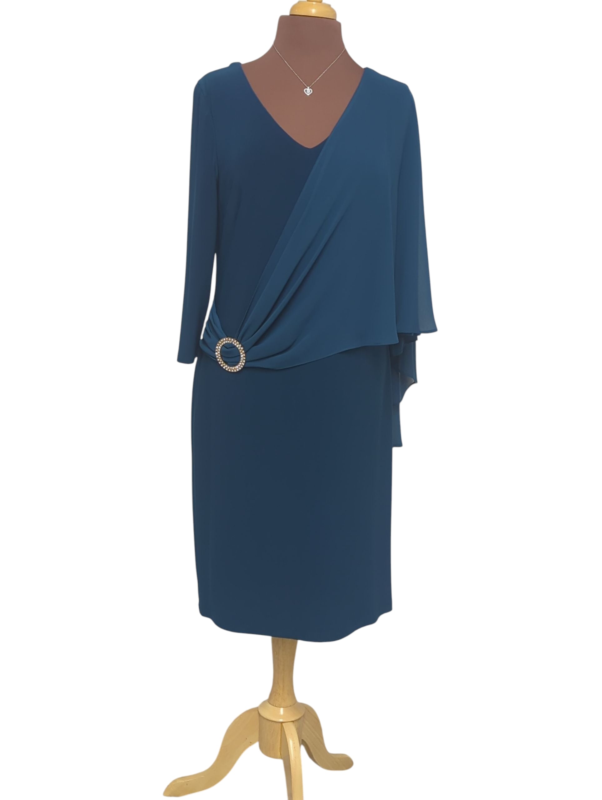 Confectionnée dans un tissu fluide, elle se distingue par son asymétrie raffinée : une manche trois-quarts et une cape légère en mousseline transparente qui apporte du mouvement et une allure chic. La taille est marquée par un détail bijoux circulaire qui illumine la silhouette. Un modèle raffiné et pratique, parfait pour se démarquer lors d’occasions spéciales.
