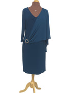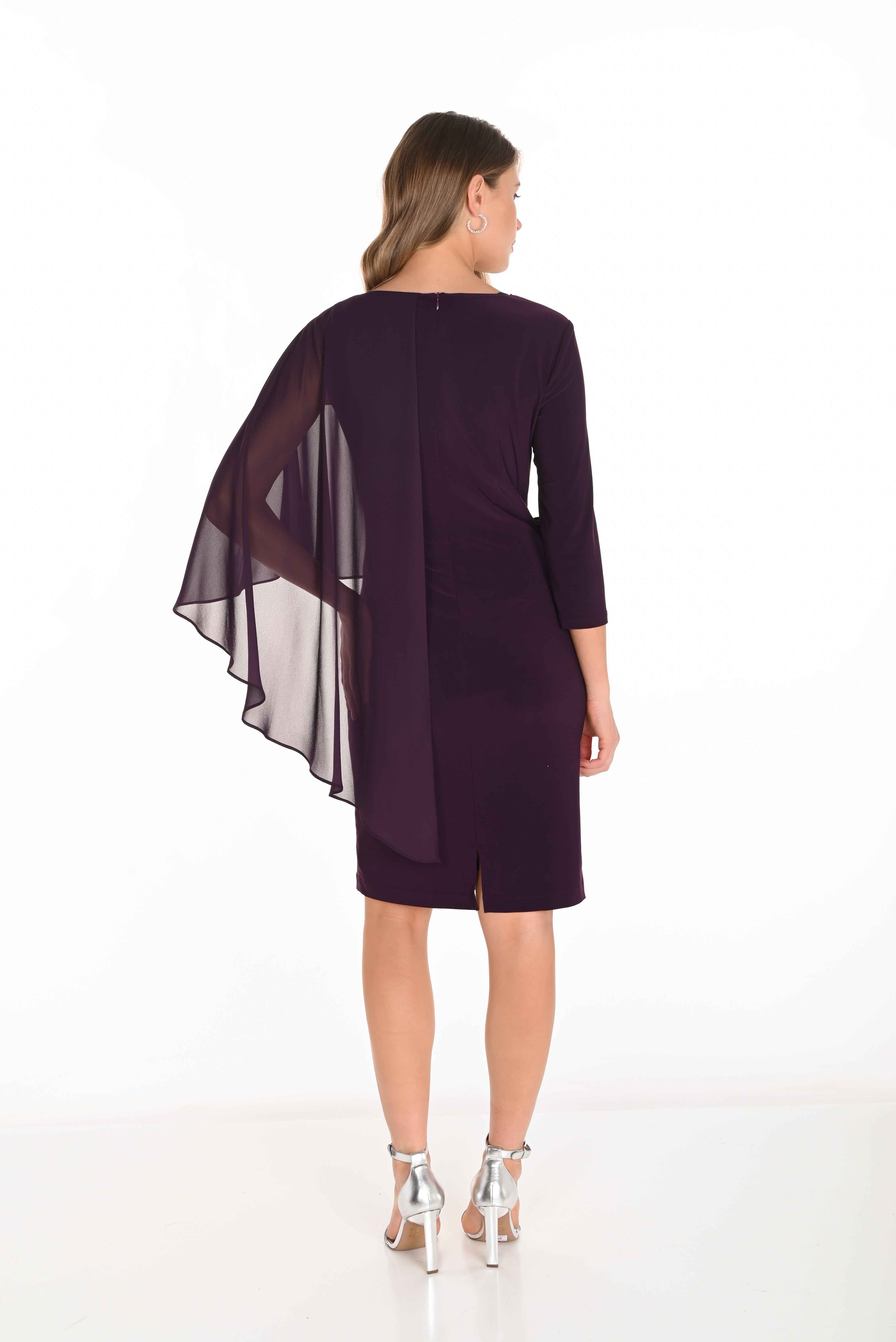 Robe courte prune avec cape asymétrique et détail bijou chic