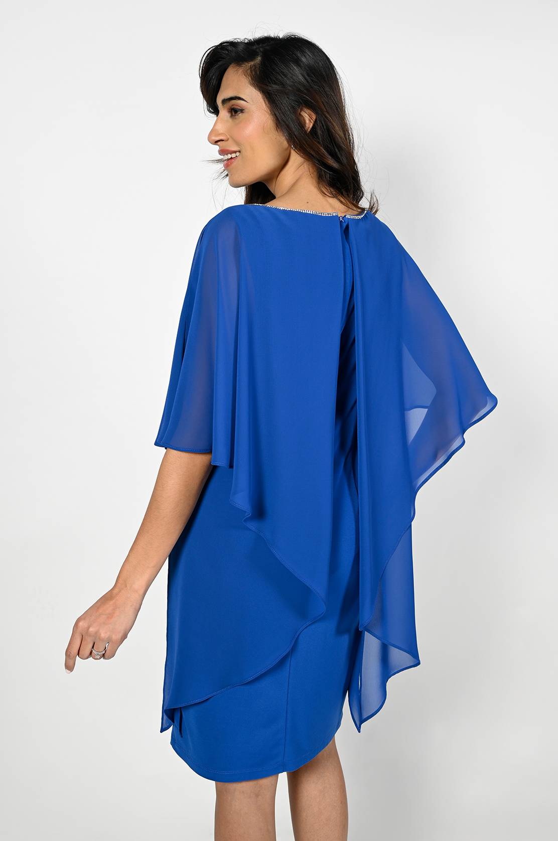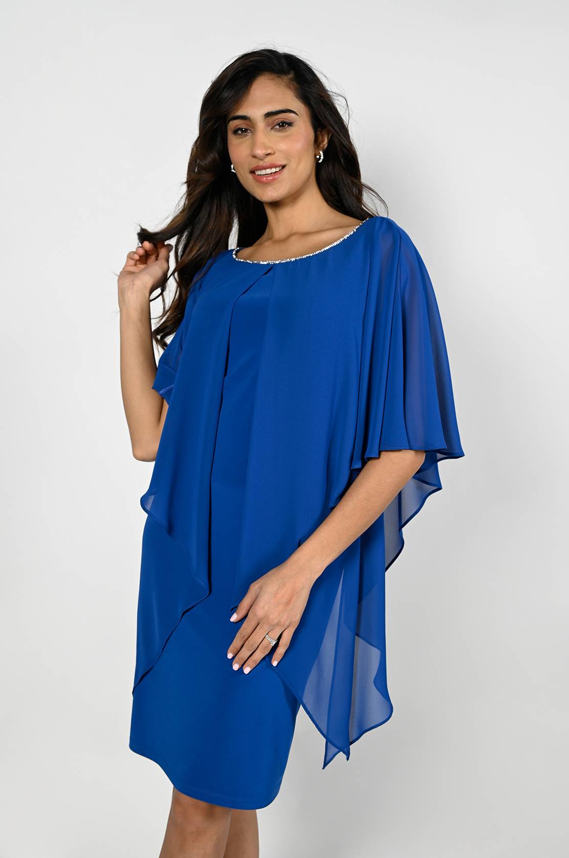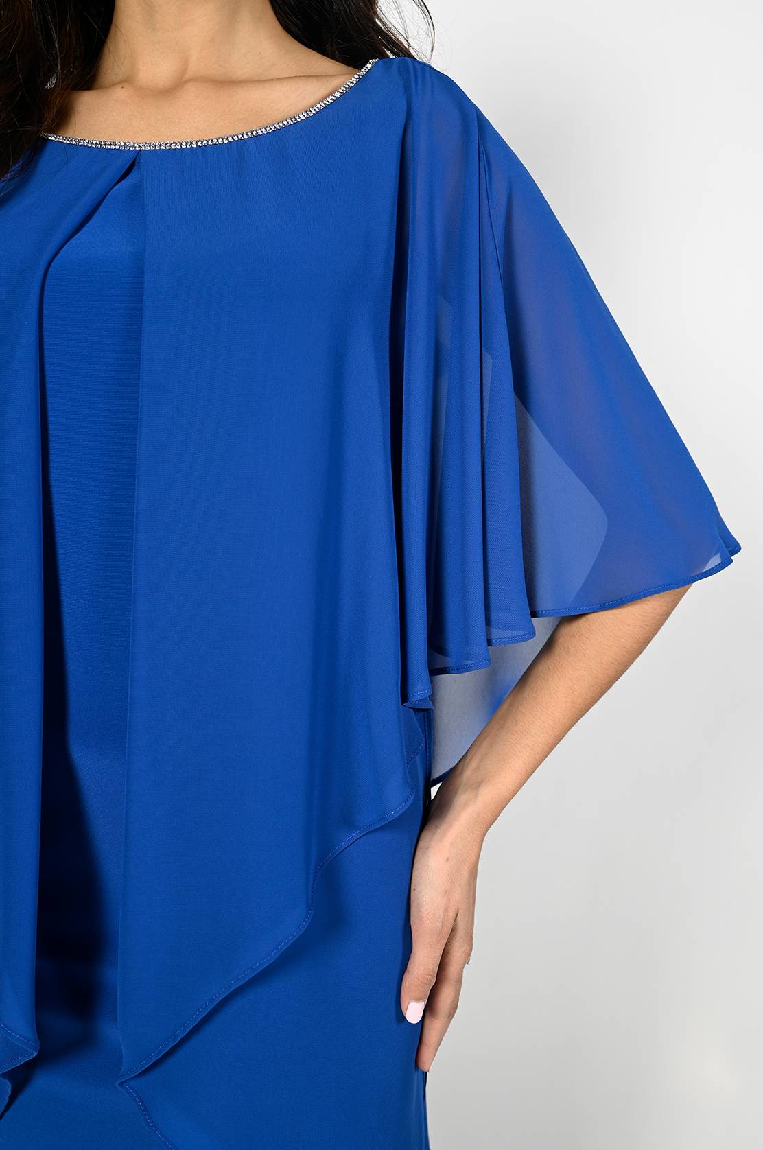 Description: Blue silky jersey dress with asymmetric chiffon overlay and rhinestone trim.