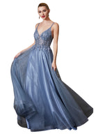 Description: A favorite! This A-line gown is layered in luxurious shimmering tulle and shimmering lace appliques. The illusion lace bodice has a deep neckline and thin double straps for an open back detail.