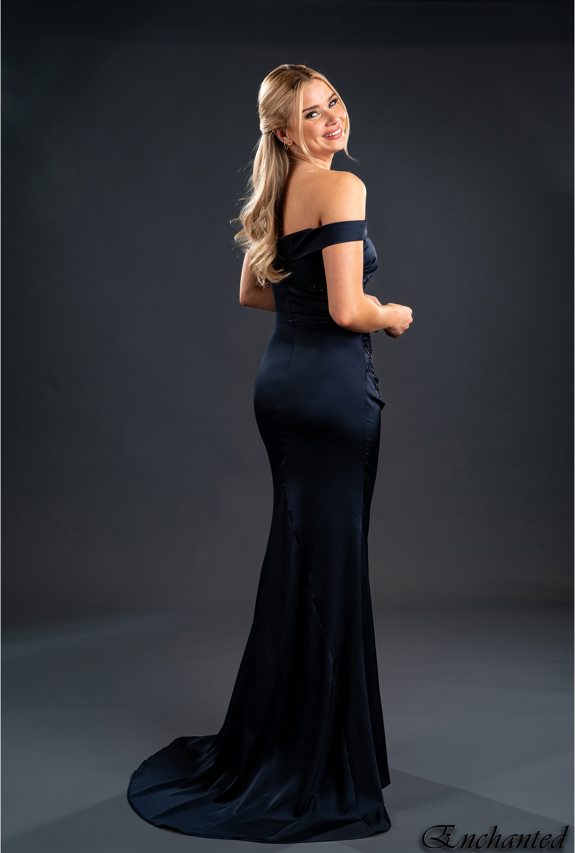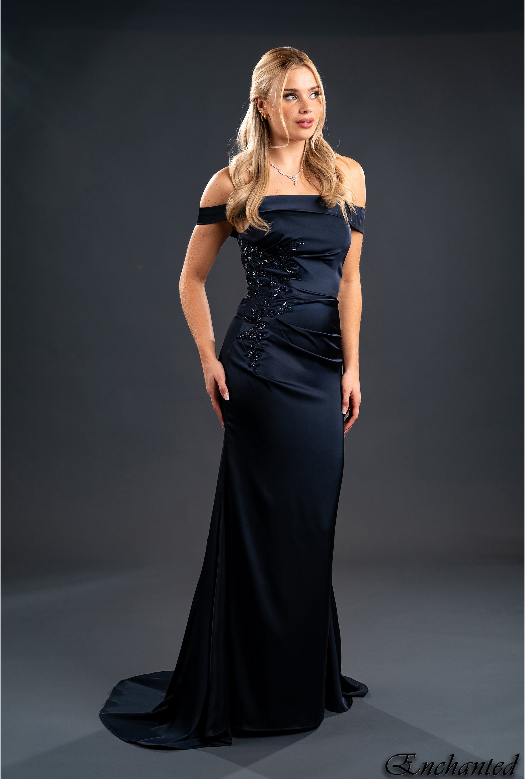 Ce modèle épaules dénudées présente un corsage drapé ajusté qui met en valeur la silhouette.
