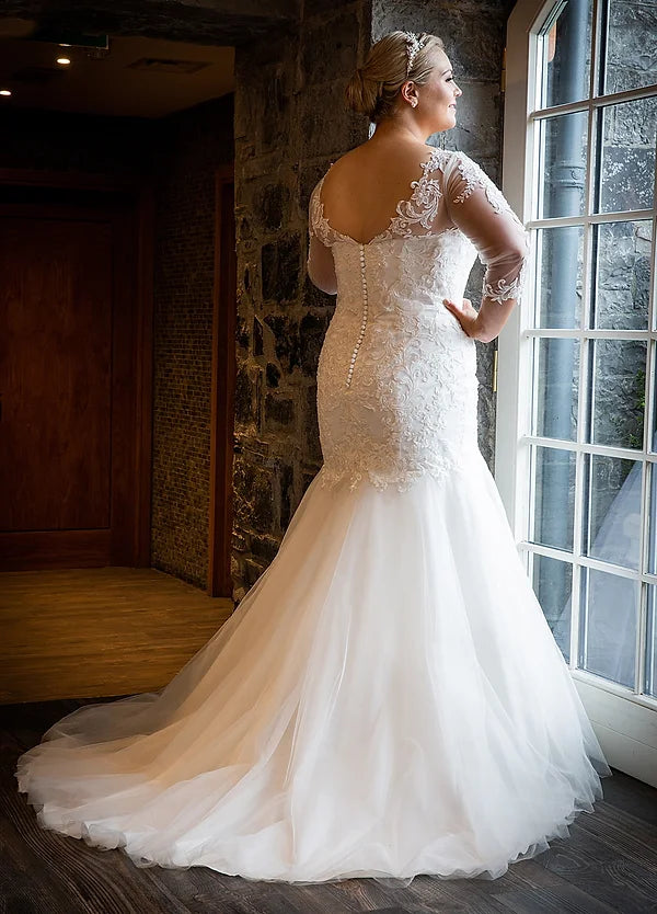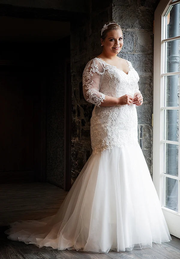 Description:The Angela dress is a classic yet unique masterpiece. It features a beaded top, sheer sleeve and lace pattern that add a touch of elegance. Its long train and tulle bottom are the perfect choice for your dream wedding. It is a tailor-made silhouette that will enhance your princess look.