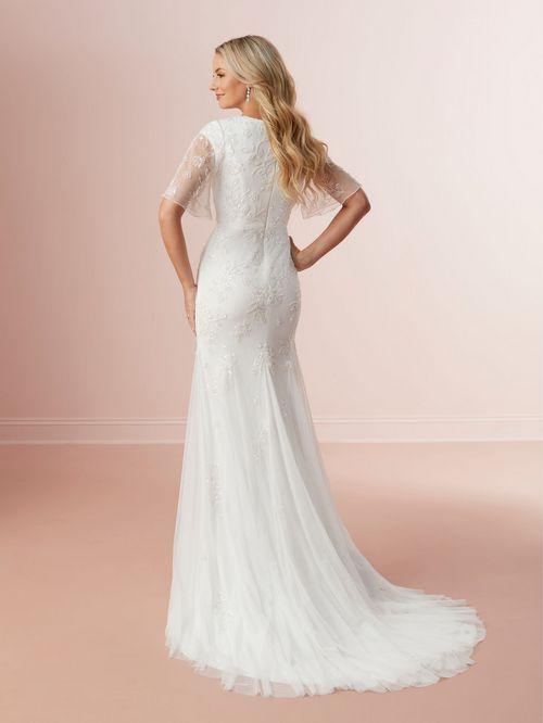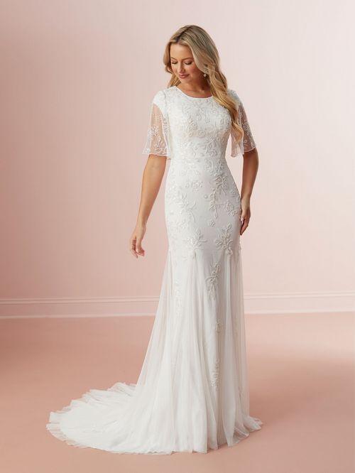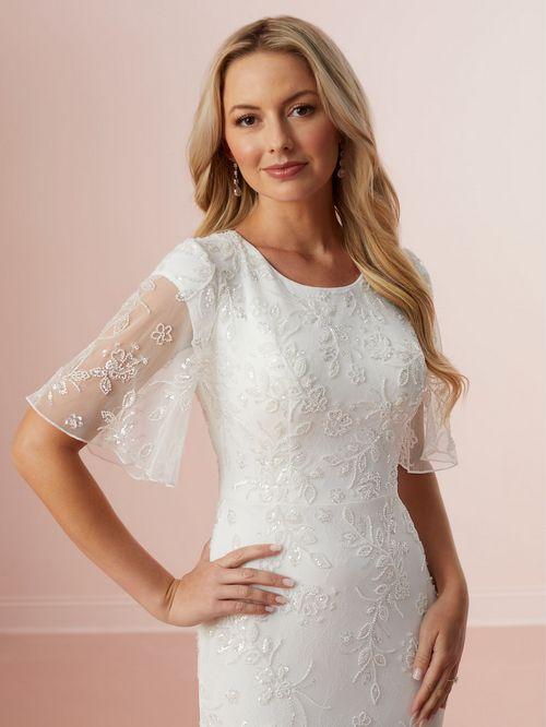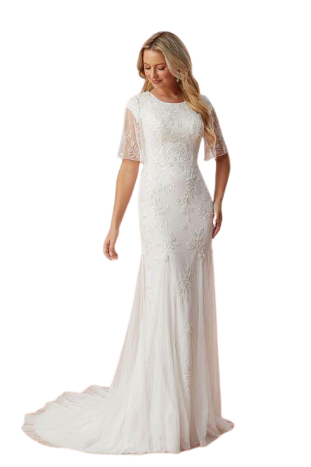 Straight dress with wide lace sleeves, pearl floral pattern, short train |
