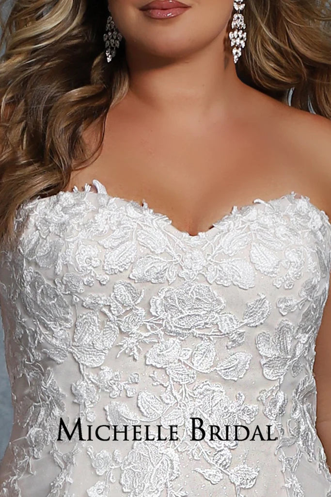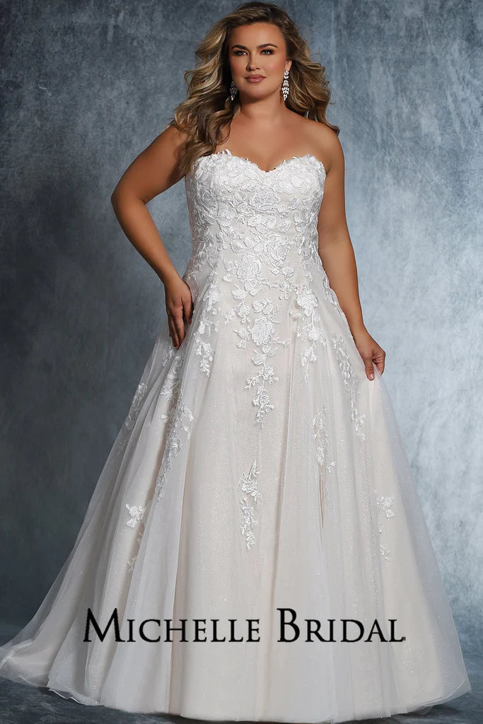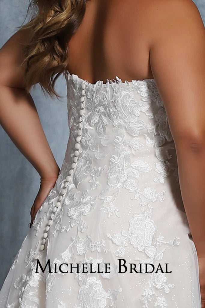 Beading: Floral lace appliques with clear sequins. Strapless, optional straps included |