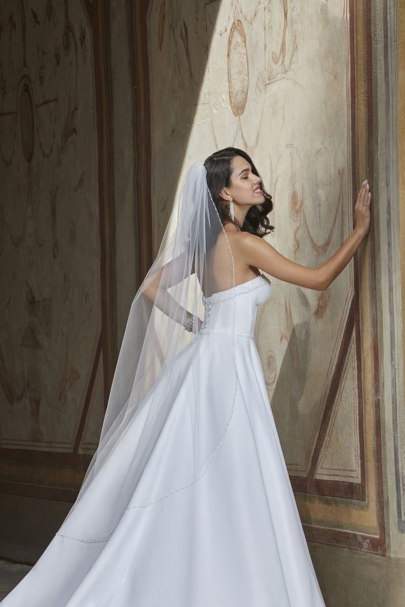 Description: Chic and simple, yet bold and sexy, Elizabelle's style features a strapless V-neck bodice accented with clusters of pearls. Boning and a plunging neckline add alluring appeal and the lace-up back adds the perfect finishing touch to this satin A-line beauty. Matching veil V257 (sold separately).