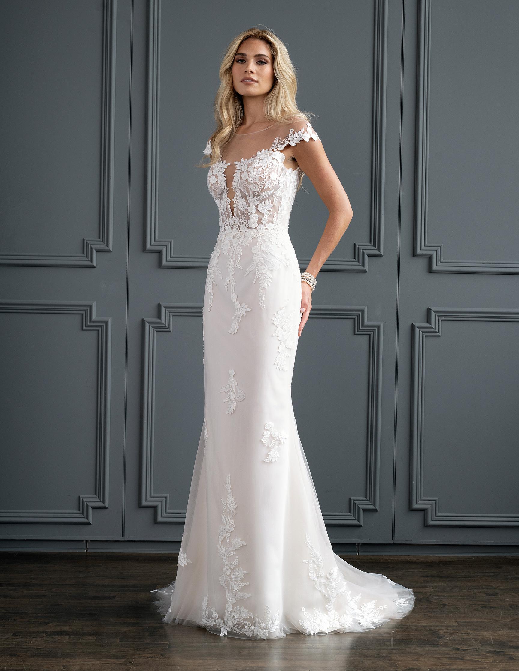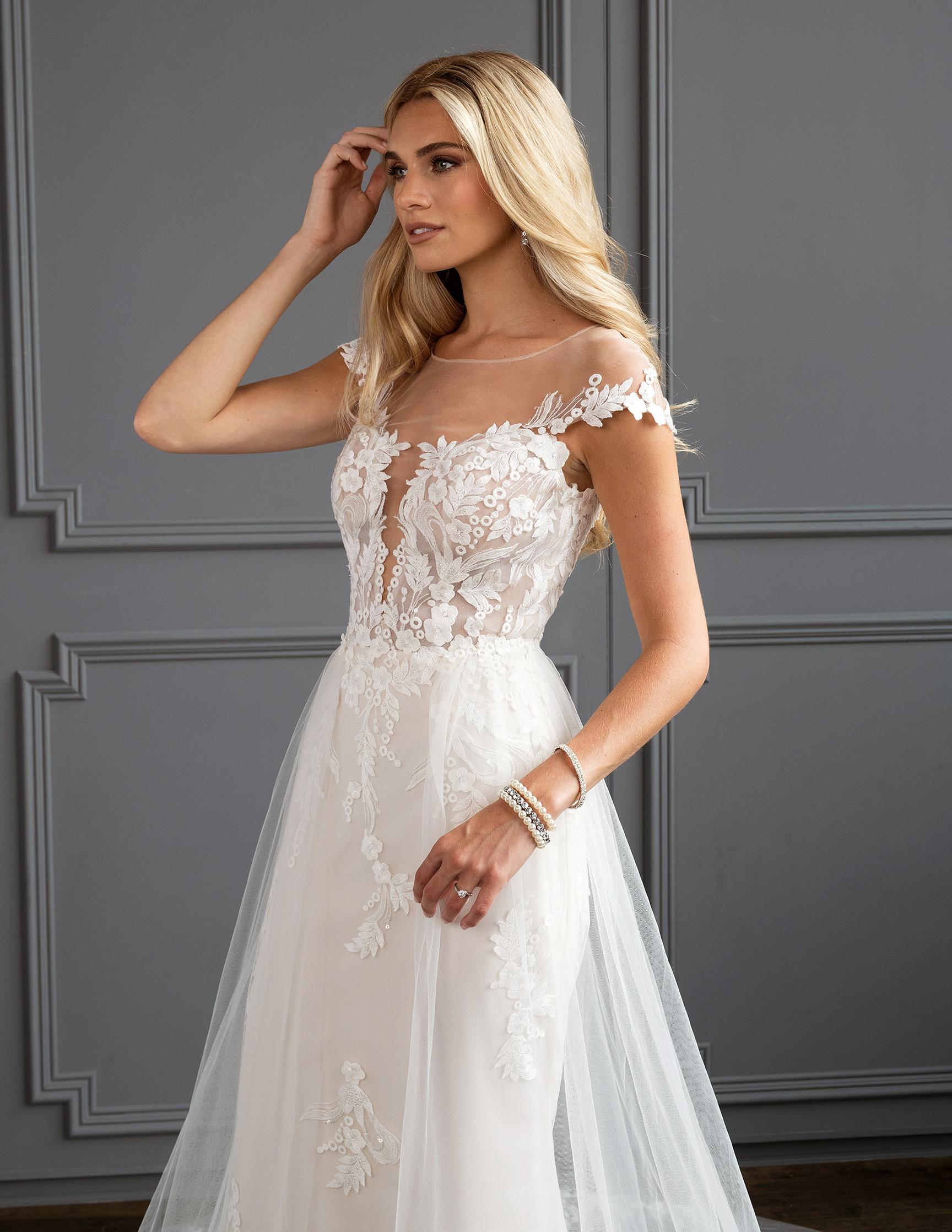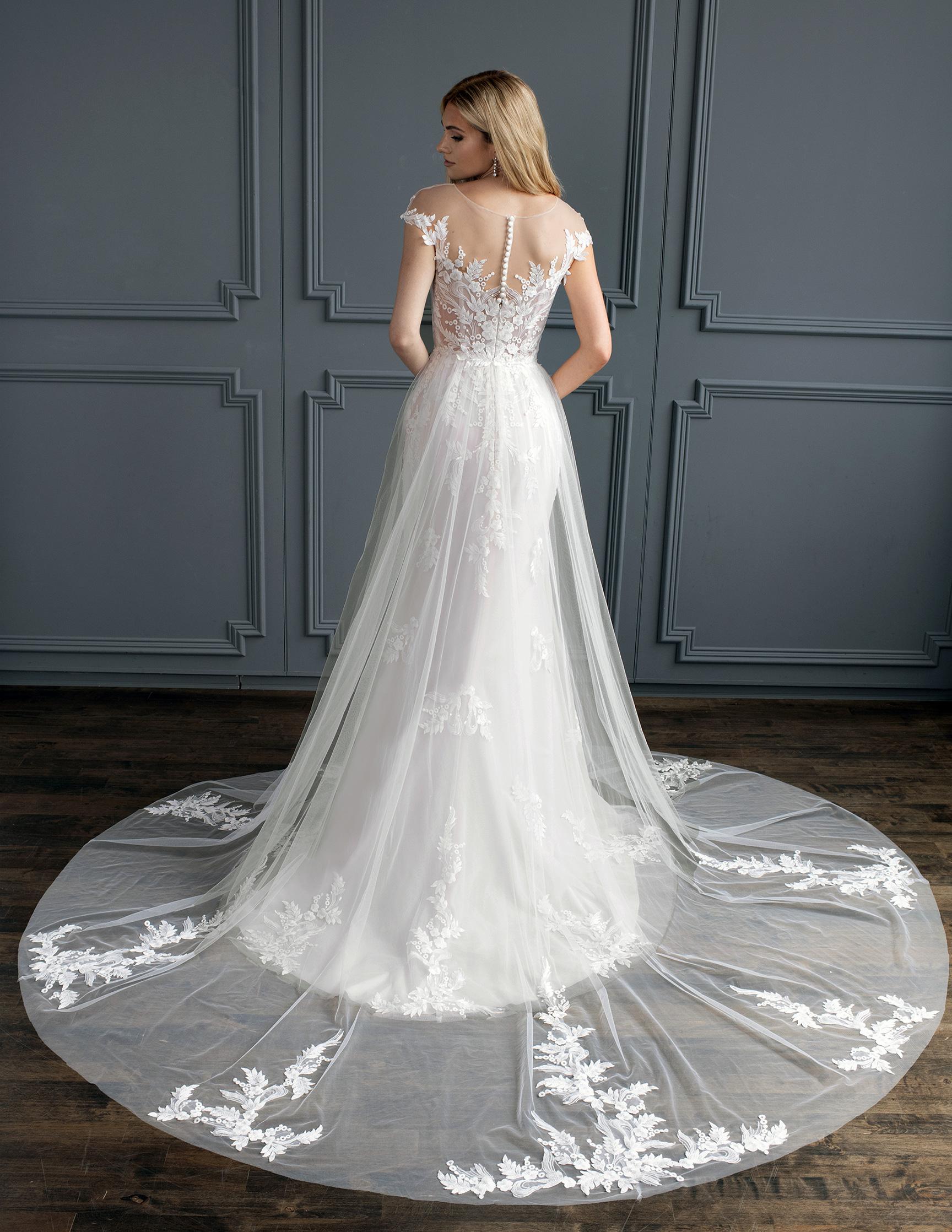 Detachable train, high quality lace appliqués, dropped strap effect |