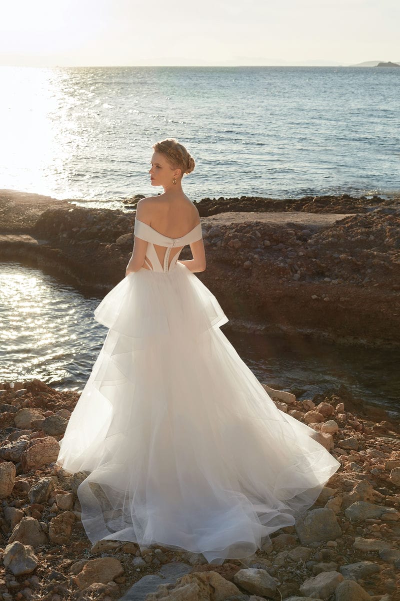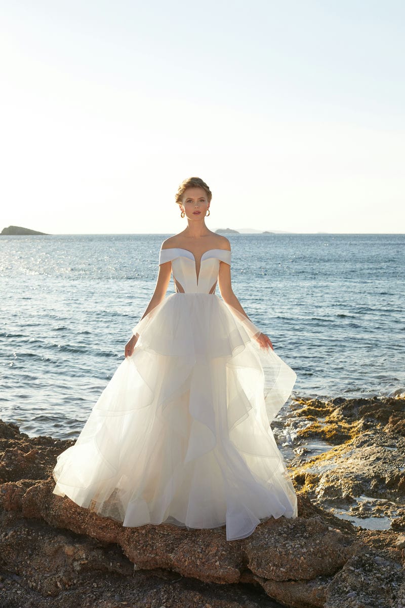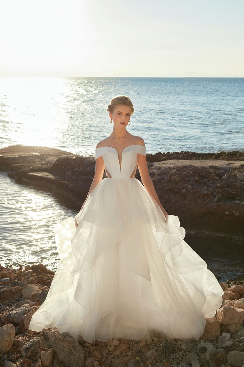 The gorgeous ruffled tulle skirt and structured mikado bodice create a gown that is both dramatic and luxurious. Revealing cut-out panels from front to back juxtapose beautifully with the portrait neckline.